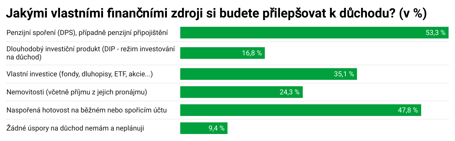 Češi si plánují přilepšovat k důchodu z vlastních zdrojů, nejčastěji z penzijního připojištění (53,3 %), a to především respondenti z generace X. Z naspořené hotovosti nebo úspor na běžném či spořicím účtu chce čerpat 47,8 % dotázaných. Peníze z investic plánuje v penzi využívat 35,1 % respondentů, častěji pak generace Z. Zdroje z dlouhodobého investičního produktu (DIP) chce čerpat 16,8 % a na zajištění nemovitostmi a výnosy z nich spoléhá 24,3 % dotázaných.