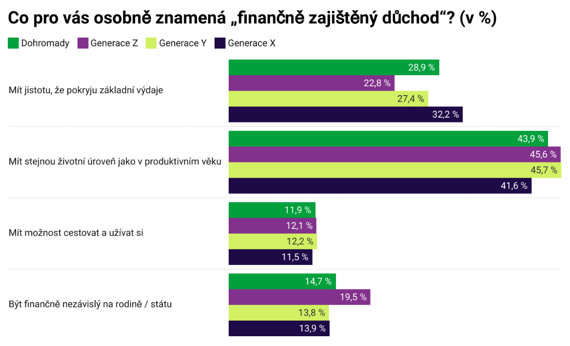 Právě inflace a výše úspor mají zásadní vliv na životní úroveň, kterou mohou budoucí důchodci v penzi očekávat. Téměř polovina respondentů průzkumu (44 %) považuje za finančně zabezpečený důchod takový, který jim zajistí stejnou životní úroveň jako během produktivního věku. Více než čtvrtina dotázaných (29 %) považuje za dostatečné pokrytí základních výdajů – tento přístup je častější u generace X (32 %). Generace Z je naopak skupinou, která se chce v důchodu nejméně omezovat.