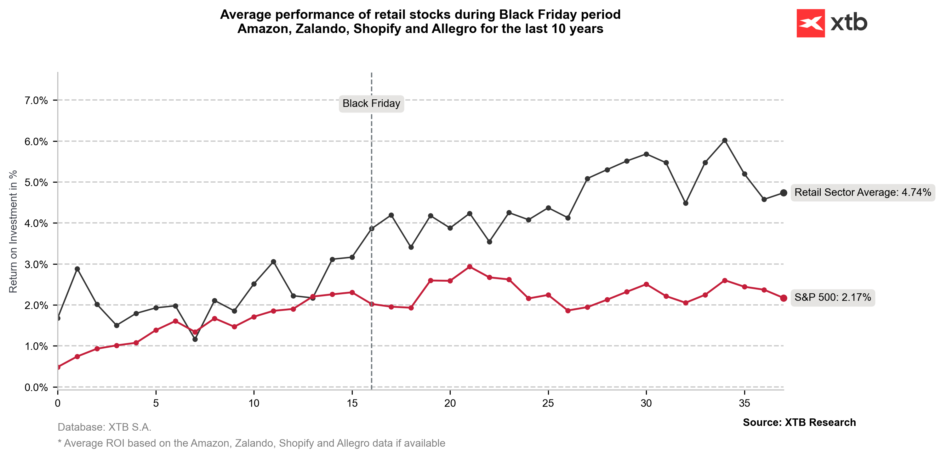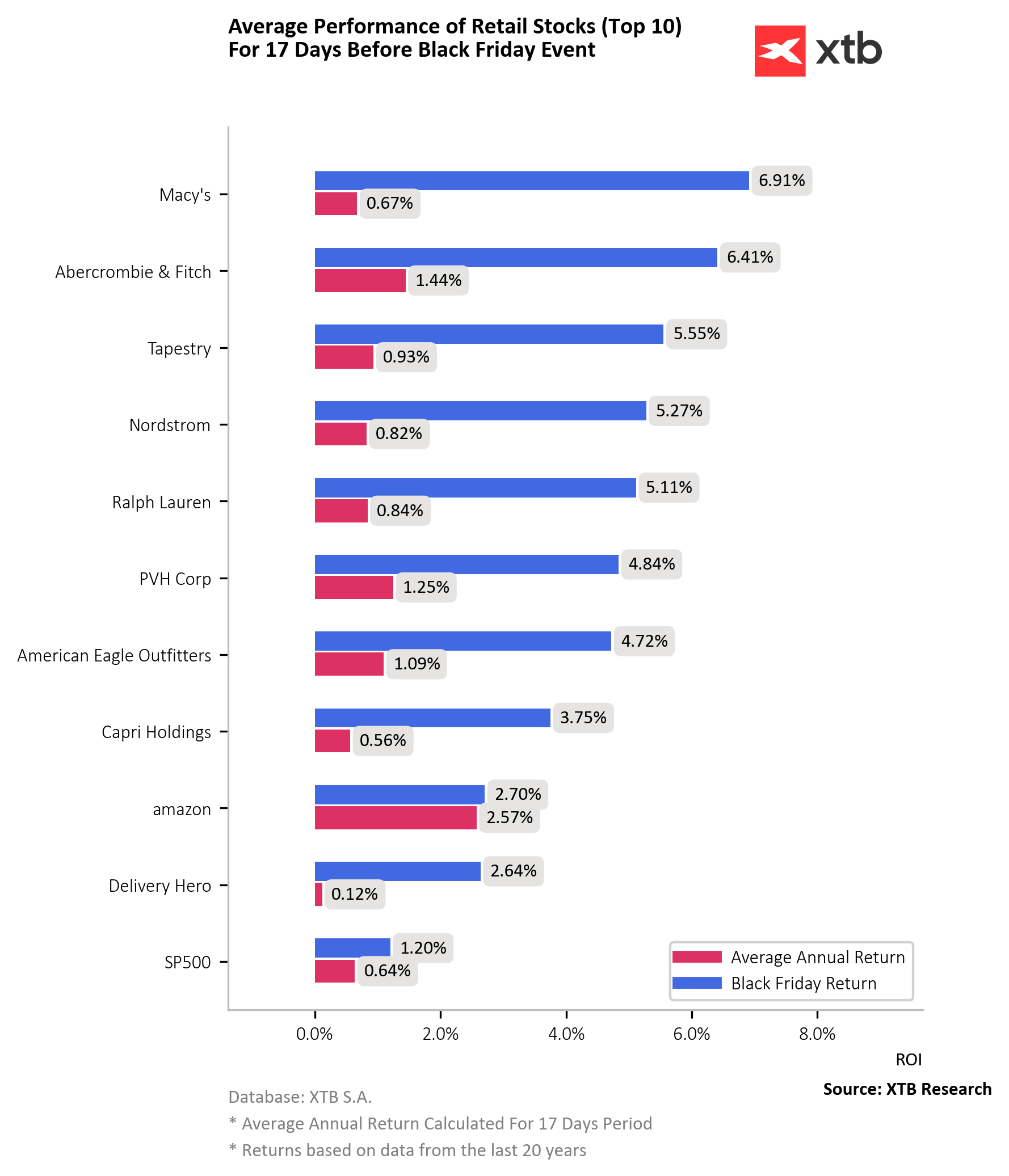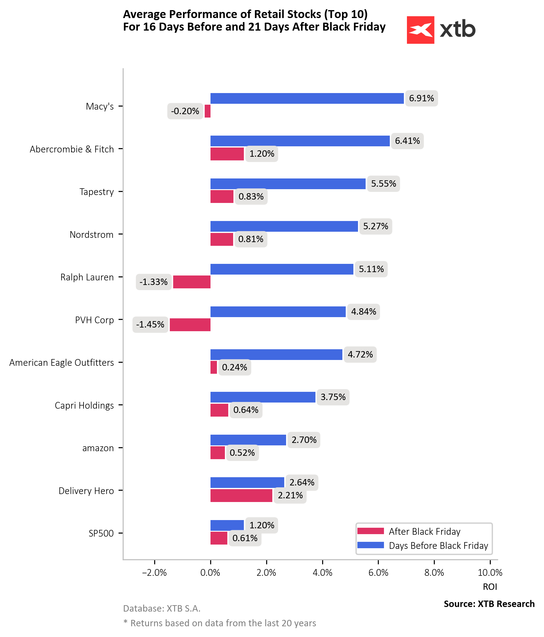 Za posledních 20 let maloobchodní akcie trvale překonávaly hlavní akciový benchmark, zejména v 17 dnech před Black Friday. Obchodní modely maloobchodníků, jako jsou Macy's nebo Tapestry Inc., znamenají, že mají tendenci těžit více ze silné maloobchodní sezóny ve 4. čtvrtletí než z jednodenní akce samotné. Black Friday však stále představuje klíčovou sezónní hranici.