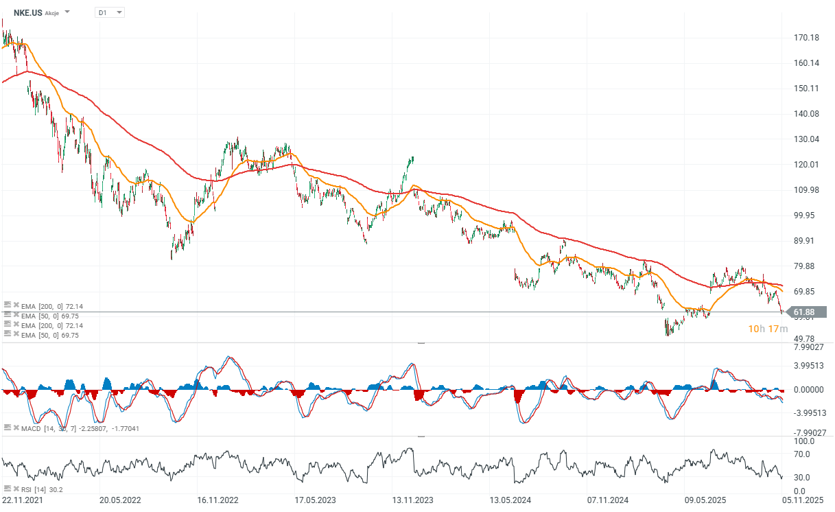 Nike klesla pod svou 200denní exponenciální klouzavou průměrnou hodnotu a obnovila období prudkého poklesu, ale příběh této značky zdaleka nekončí. Společnost vstupuje do období Black Friday s potenciálem překvapit jak sentimentem, tak fundamenty.