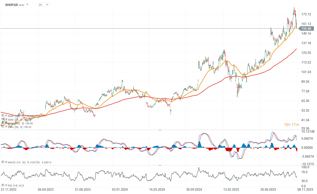 Akcie společnosti Shopify v poslední době zaznamenaly mírný pokles a ustoupily asi o 10 % od svých rekordních maxim, přesto však nadále respektují širší vzestupný kanál. Společnost zůstává v centru globálního ekosystému elektronického obchodování – pohání miliony online obchodů – a sezónnost by mohla znovu vzbudit zájem kupujících, jakmile se cena přiblíží dolní trendové linii podpory.