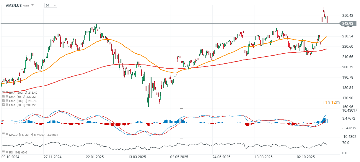 Z technického hlediska se cena akcií Amazonu odrazila od historických maxim a nyní testuje zónu průlomu po zveřejnění výsledků poblíž 242 USD, což také odpovídá vrcholu z ledna 2025.