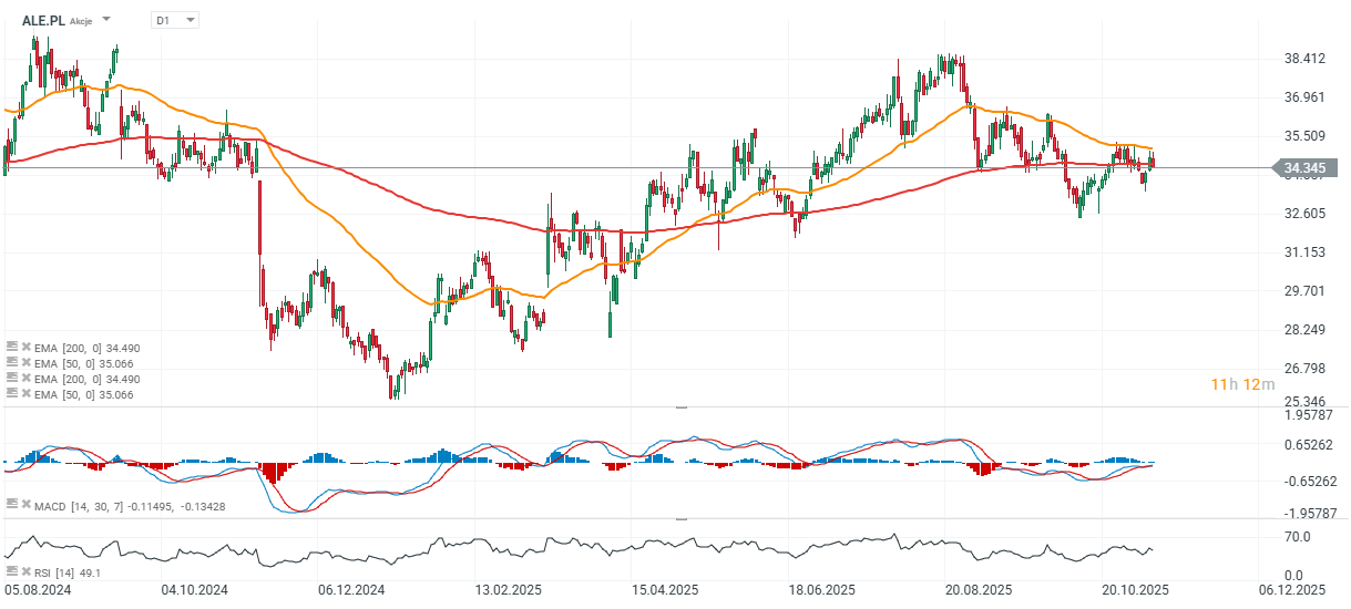 Z technického hlediska akcie brání významnou zónu podpory kolem 34 PLN, definovanou 200denním EMA (červená čára). Úspěšný odraz v této oblasti by mohl potvrdit návrat býčího momenta u lídrů maloobchodních technologií ve střední a východní Evropě.