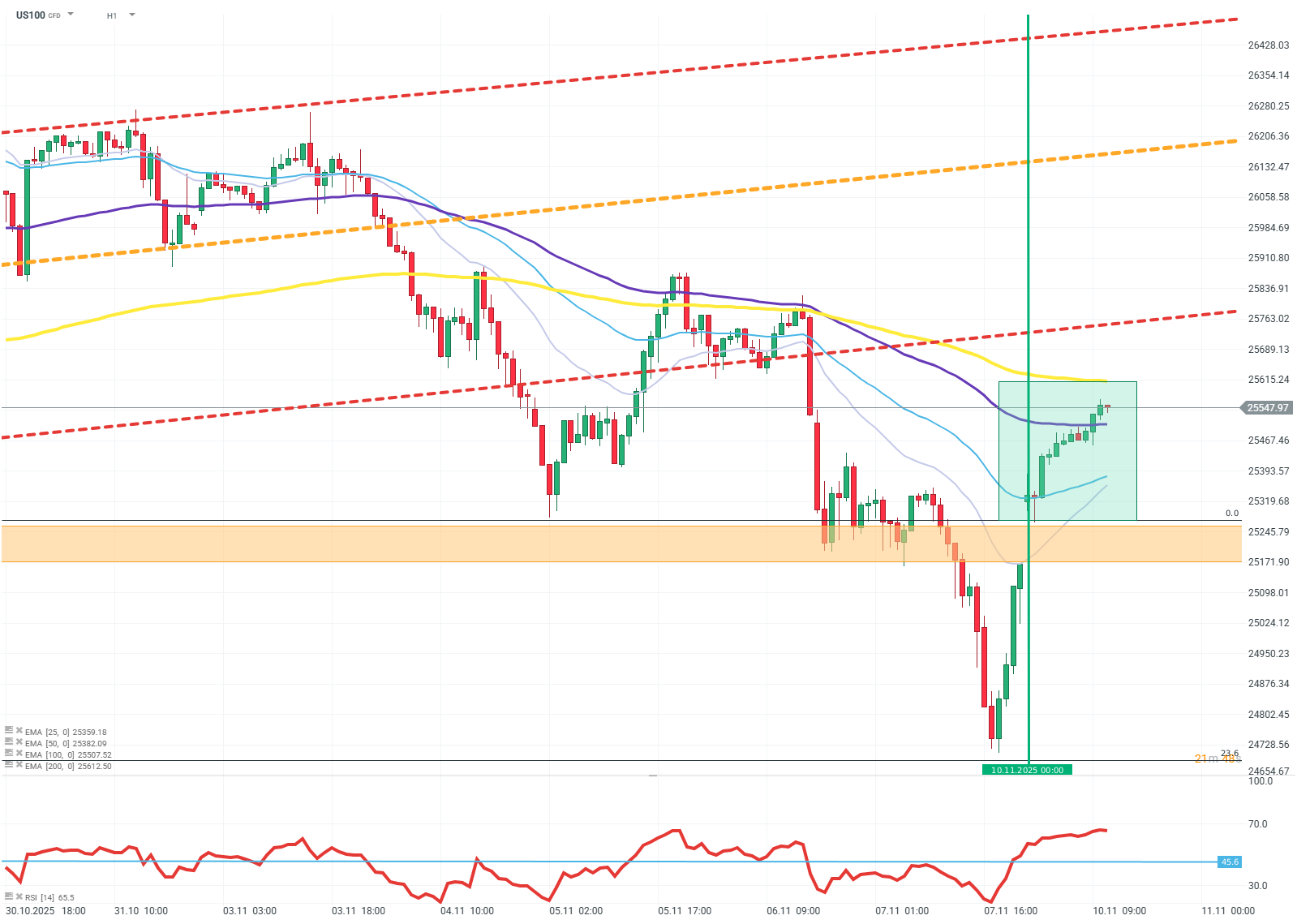 Futures na US100 dnes před otevřením amerického trhu rostou přibližně o 1,5 %, když částečně korigují nedávné ztráty díky zlepšující se náladě ohledně pokračující rozpočtové uzávěry americké vlády.