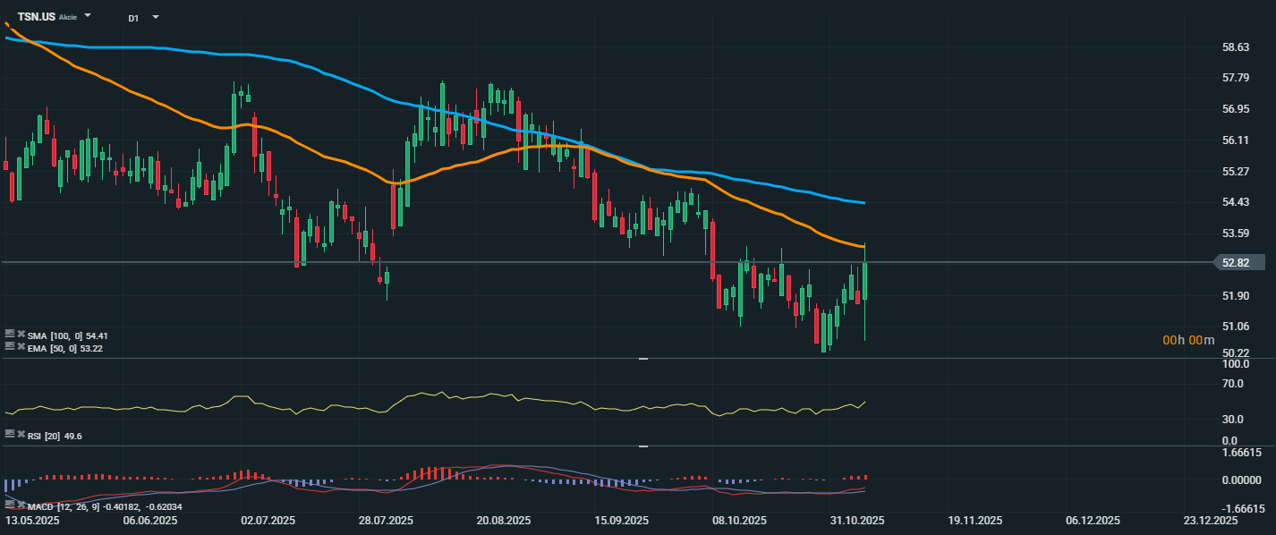 Akcie společnosti Tyson Foods se aktuálně obchodují kolem ceny 52,82 USD a nachází se v blízkosti důležitých technických úrovní. Cena se přiblížila ke klouzavému průměru EMA 50 (53,22 USD), který společně s SMA 100 (54,41 USD) tvoří zónu rezistence, jež může rozhodnout o dalším směru vývoje. Po delším klesajícím trendu zaznamenala cena mírné oživení, ale zatím bez jasného potvrzení obratu. Indikátor RSI se pohybuje na hodnotě 49,6, tedy přesně na prahu neutrální zóny – trh je tedy z hlediska síly nákupního a prodejního tlaku vyrovnaný.