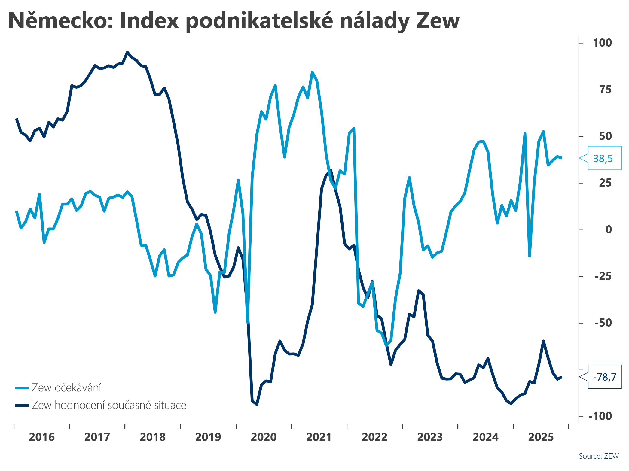 Index podnikatelské nálady Zew očekávání v červenci klesl na 41,8 b. oproti 47,5 b. v červnu. Trhy očekávaly pokles na 41 b. Index Zew hodnocení současné situace se zlepšil na úroveň -68,9 b. oproti -73,8 b. v červnu. Trhy očekávaly zhoršení na -74,8 b. -