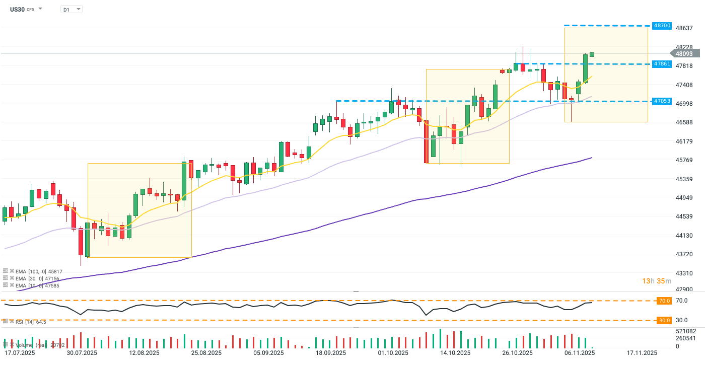 US30 pokračuje v růstu poté, co včerejší seanci uzavřel na rekordní hodnotě kolem 48 000 (+1,3 %), a to díky masivní rotaci kapitálu napříč Wall Street. Zatímco potenciální ukončení shutdownu americké vlády podporuje široký optimismus na trhu, přetrvávající obavy z vysokého ocenění v sektoru umělé inteligence přesměrovaly kapitál k tradičnějším hodnotovým akciím.