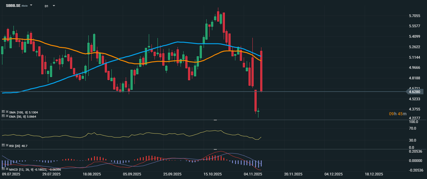 Akcie švédské realitní skupiny SBB reagovaly na oznámení prodeje portfolia pečovatelských domů prudkým cenovým pohybem. Cena akcií dnes otevřela na 5,25 SEK, postupně však cena klesla a aktuálně se obchoduje na úrovni 4,6280 SEK. Navzdory dnešnímu prudkému růstu se akcie opět propadly pod oba klouzavé průměry – EMA 50 (5,0664 SEK) i SMA 100 (5,1304 SEK) – což značí, že dlouhodobý trend zůstává negativní. RSI se pohybuje na hodnotě 40,7, tedy v blízkosti přeprodané oblasti, což naznačuje, že prodejní tlak slábne.