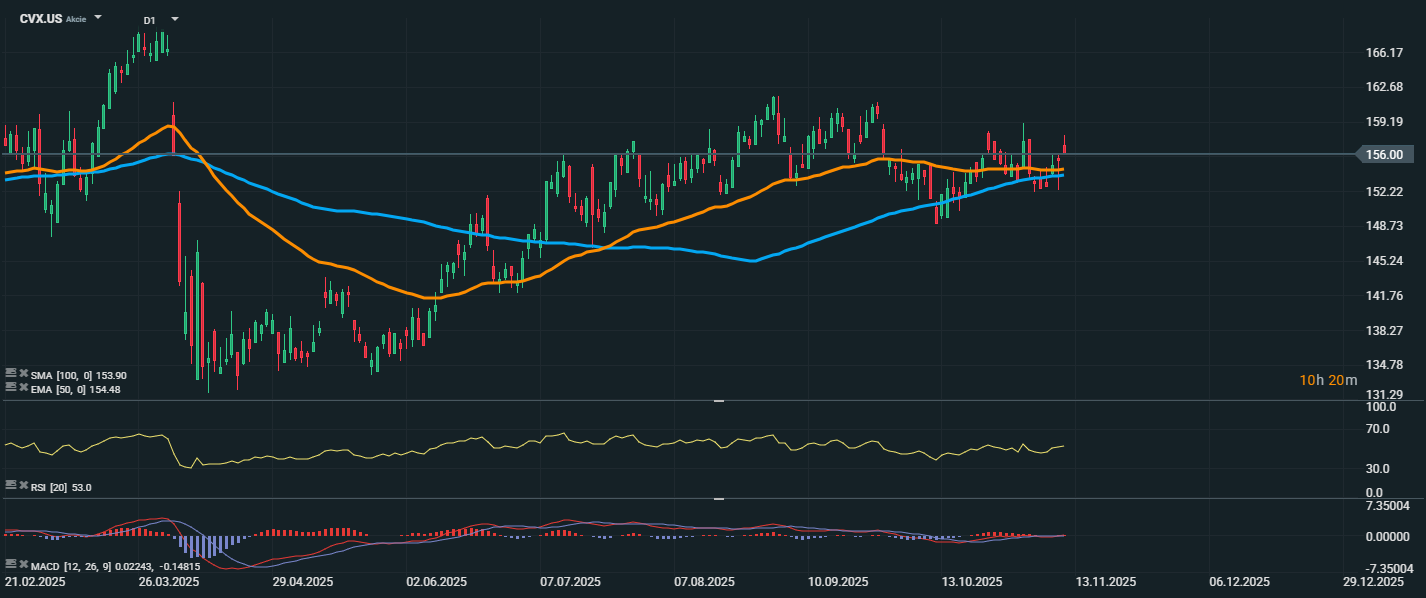 Akcie společnosti Chevron se aktuálně obchodují na úrovni 156,00 USD, což znamená mírné proražení nad klouzavé průměry. Cena se nachází nad EMA 50 (154,48 USD) i nad SMA 100 (153,90 USD), což technicky značí přechod do býčího nastavení a potenciální začátek nové růstové fáze. RSI osciluje kolem hodnoty 53, tedy v neutrální zóně, což dává akciím prostor pro další růst bez rizika překoupení.
