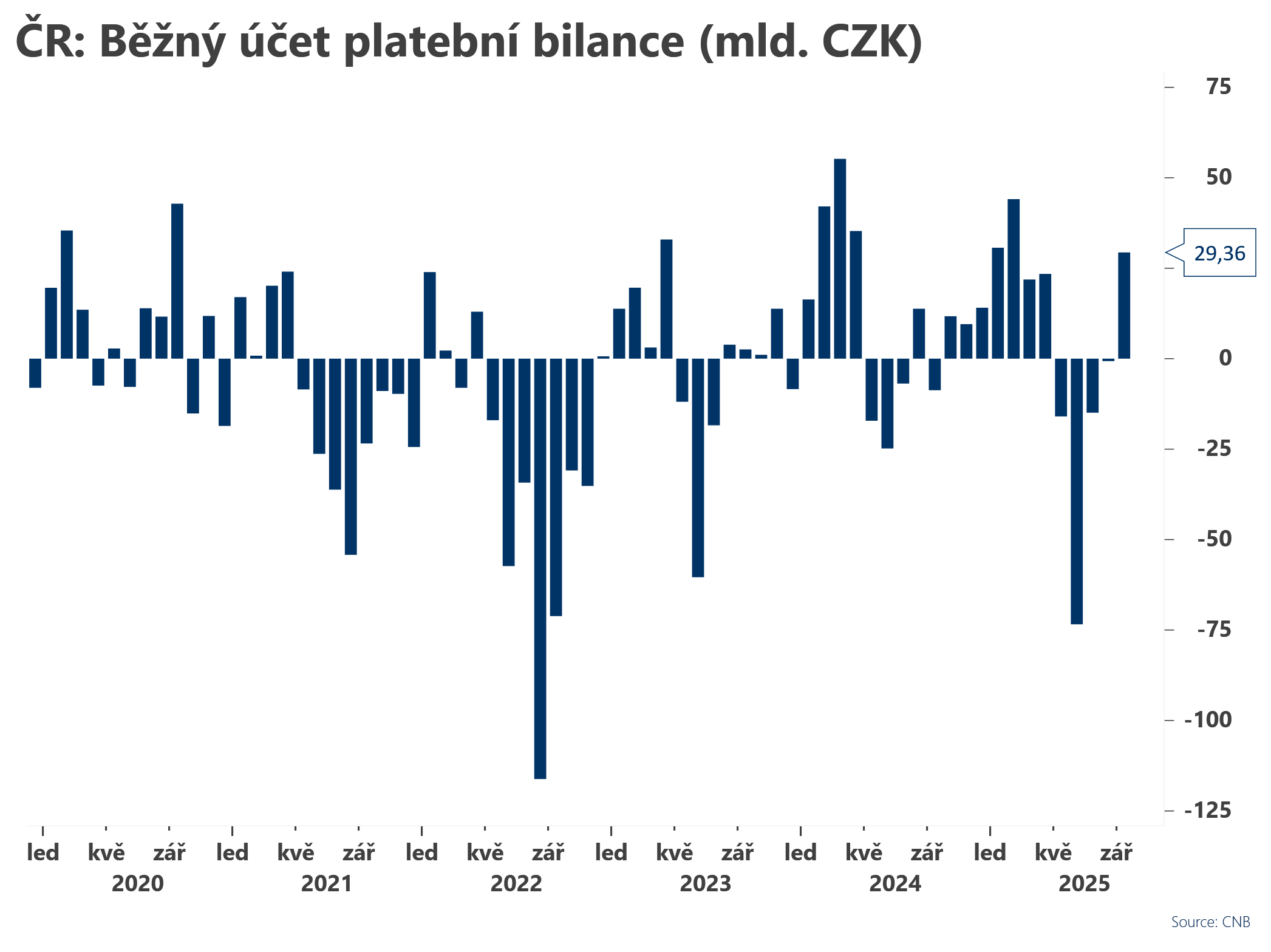 Běžný účet platební bilance dosáhl v říjnu deficitu 3,7 mld. CZK, tedy výrazně méně, než trh očekával (16,8 mld. CZK). Za lepším výsledkem stál především zahraniční obchod, který v metodice platební bilance dosáhl deficitu pouze 0,1 mld. CZK. Výrazný nebyl ani odliv dividend, který v říjnu činil 4 mld. CZK. V prvotních a druhotných důchodech se pak pozitivně odrazilo aktivní saldo převodů z rozpočtu EU do ČR (6,3 mld. CZK). Na kapitálovém účtu pak příjmy z rozpočtu EU dosáhly 3,5 mld. CZK. -
