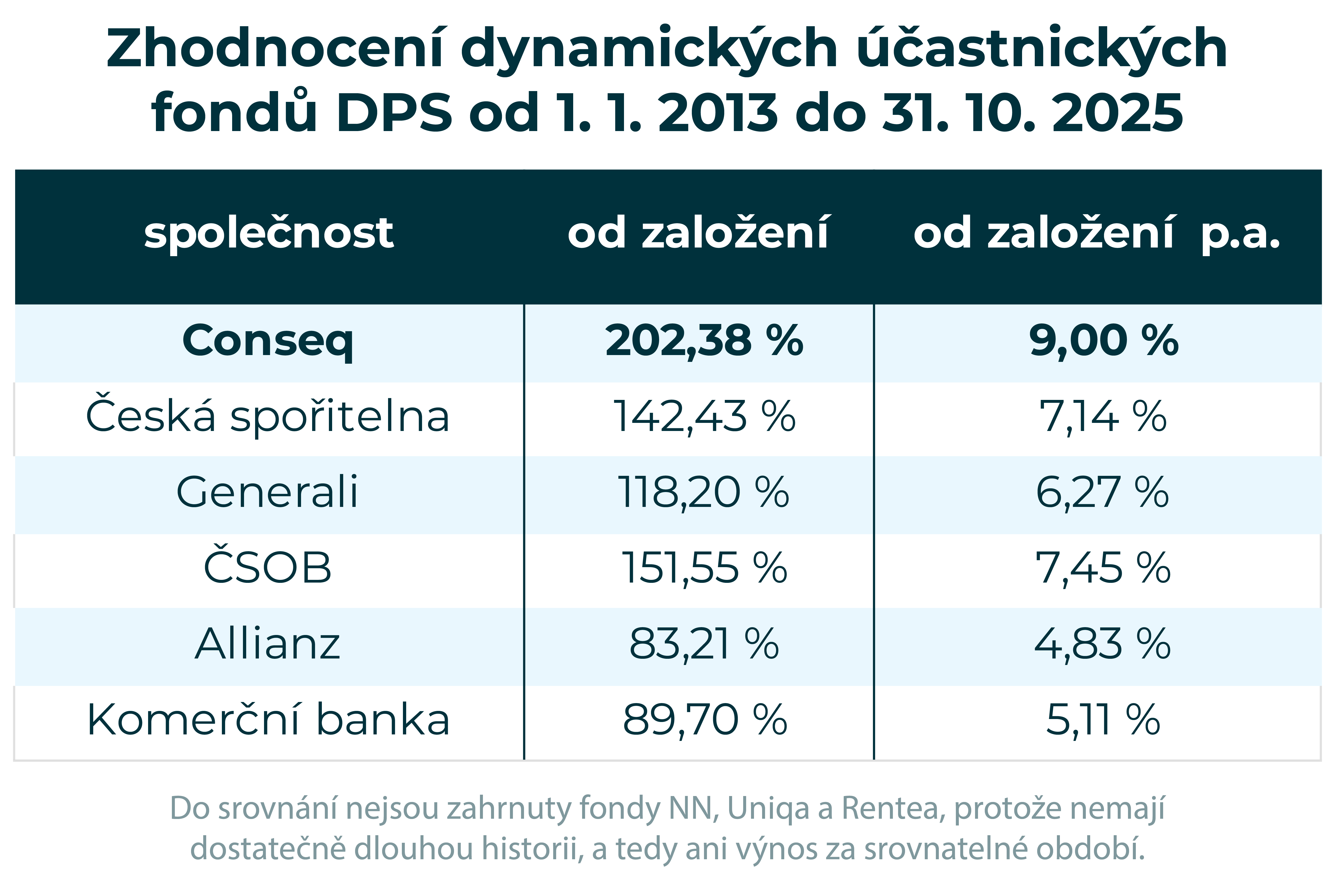K 29. říjnu 2025 Conseq globální akciový účastnický fond (GLAK) jako první penzijní účastnický fond v České republice překonal hranici 3 korun za jednotku. Tím od svého založení 19.2.2013 během necelých 13 let dosáhl celkového zhodnocení přes 200 %, což odpovídá průměrnému ročnímu výnosu 9,1 % (po započtení všech poplatků). V současnosti spravuje aktiva blížící se hodnotě 20 mld. Kč.