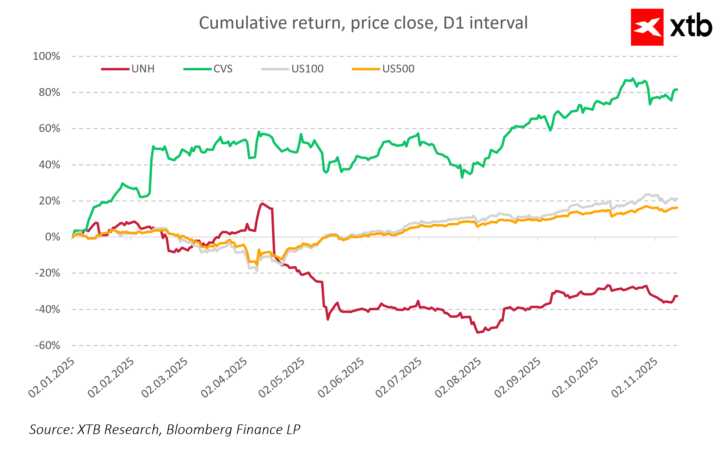 Od začátku roku 2025 do listopadu vzrostly akcie CVS o více než 80 %, čímž jasně překonaly indexy Nasdaq-100 a S&P 500 i konkurenta UnitedHealth Group, jehož akcie klesly téměř na polovinu.
