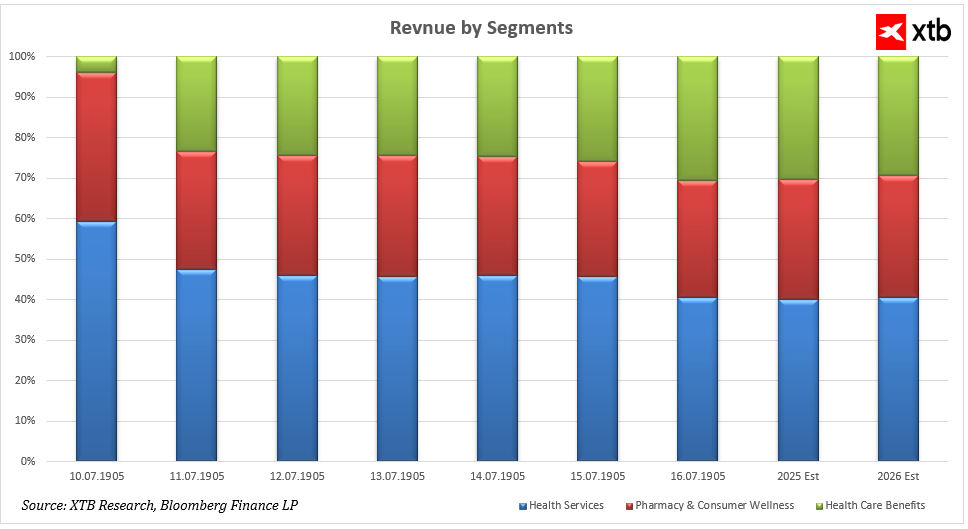 Postupem času však jeho podíl na tržbách klesal, zatímco na významu nabývaly segmenty Health Care Benefits a Pharmacy & Consumer Wellness. Od roku 2019 segment Health Care Benefits, který zahrnuje veřejné i komerční zdravotní pojištění, výrazně rostl. Tento růst je podporován zvyšující se poptávkou po soukromém a státním pojištění i začleněním nových modelů poskytování zdravotní péče, jako jsou Oak Street Health a Signify Health.