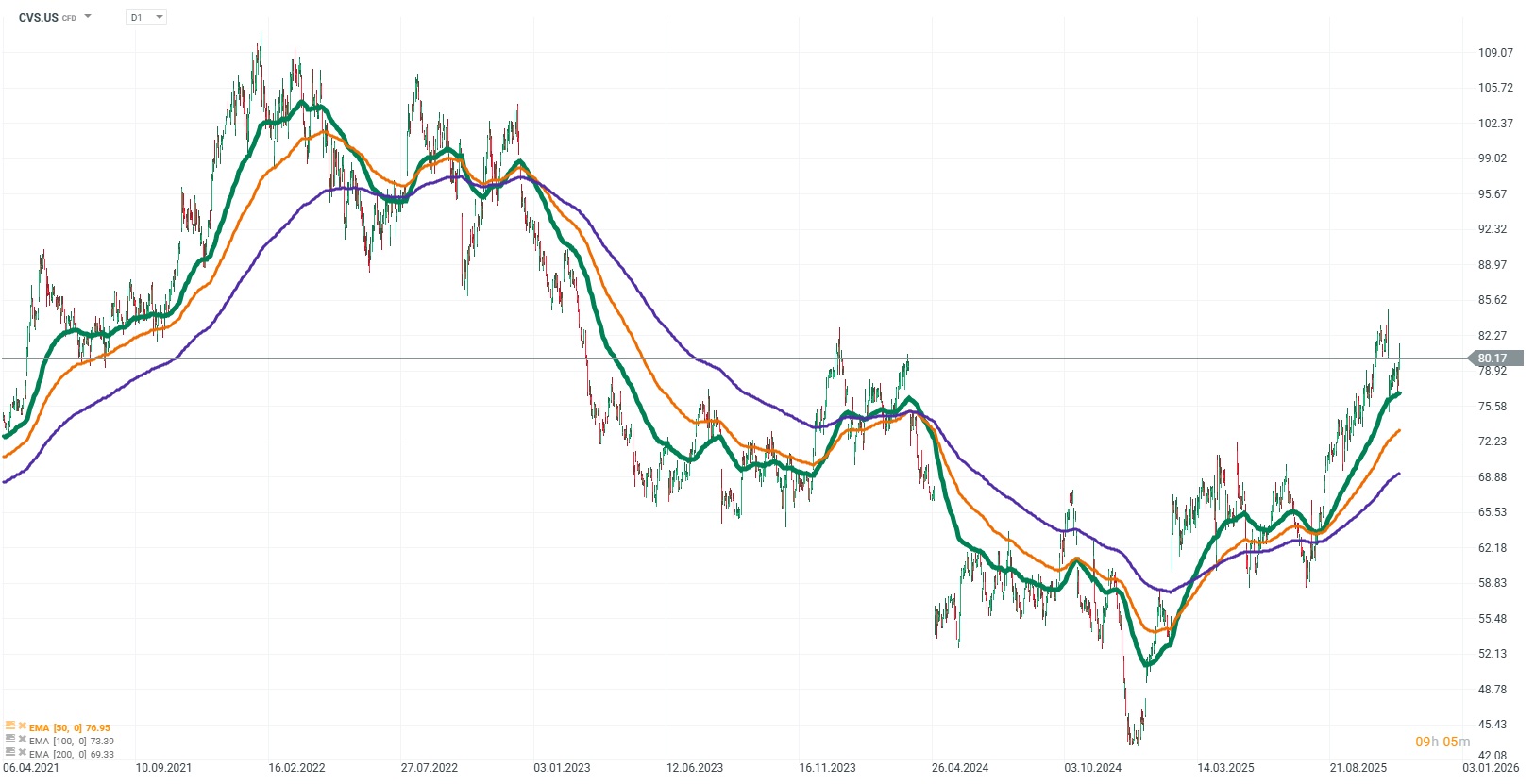 Akcie CVS Health se aktuálně nacházejí ve velmi silném růstovém trendu. Cena výrazně překonala všechny klíčové klouzavé průměry a ustálila se nad hranicí 80 USD.