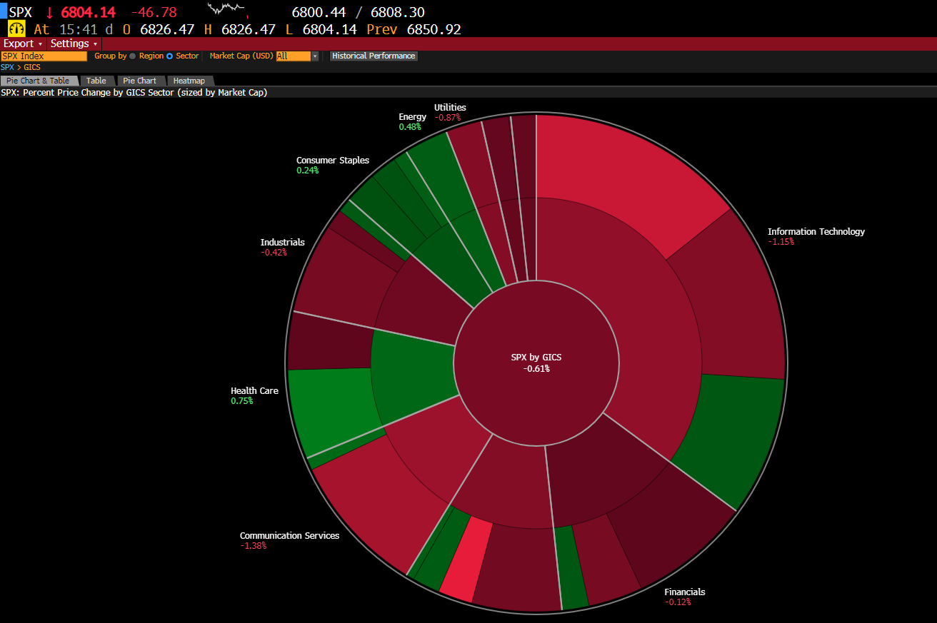 Tahouny poklesu jsou technologické společnosti a maloobchodní řetězce. Průmyslový sektor klesá mírněji a zdravotnictví je jediný sektor, který dnes vykazuje růst.