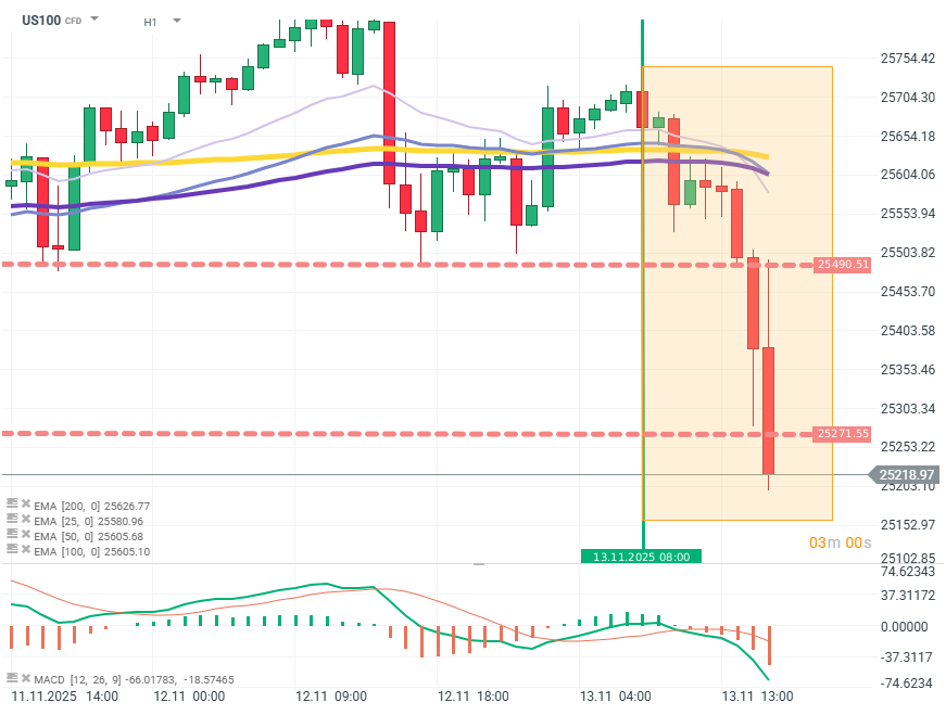 Index US100 dnes klesl o 0,5 %, přičemž poklesy dočasně dosáhly až 0,8 %. Od historického maxima, kterého bylo dosaženo těsně před začátkem obchodování, index odepsal až 1 %. Ztráty jsou způsobeny rostoucím skepticismem ohledně sektoru umělé inteligence (AI), přičemž pozornost se soustředí zejména na společnost Oracle Corp. -