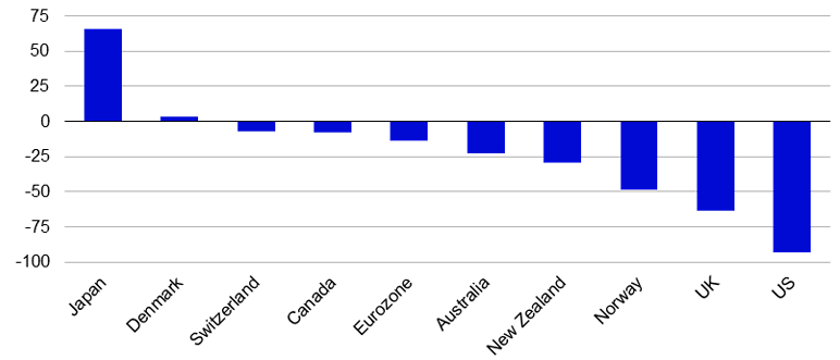 Obrázek 1: Trhem implikovaná změna sazeb centrální banky do konce roku 2026 (bazické body)