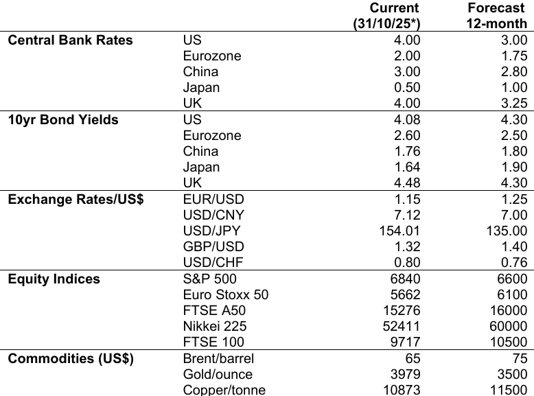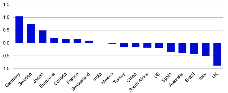 Německo zřejmě bude hlavní ekonomikou, která v roce 2026 zaznamená největší fiskální impuls (kolem 1,0 % HDP) v důsledku dodatečných výdajů na armádu a infrastrukturu. Také se očekává, že japonská vláda podpoří svou ekonomiku, přičemž nově jmenovaná premiérka Takaichi klade důraz na opatření související s životními náklady, investicemi do růstových odvětví a vojenskými výdaji. Zatím je však ještě příliš brzy odhadovat rozsah této dodatečné podpory. Vzhledem k veškerým diskusím o „One Big Beautiful Bill Act“ prezidenta Trumpa se může zdát překvapivé, že v USA se v roce 2026 nepředpokládá žádný fiskální stimul. Důvodem je, že některá z důležitých opatření v tomto rozpočtu se týkala spíše zrušení plánovaných daňových zvýšení než snížení daní. Jedná se tedy spíše o prevenci fiskálního tlaku než o poskytnutí stimulu.