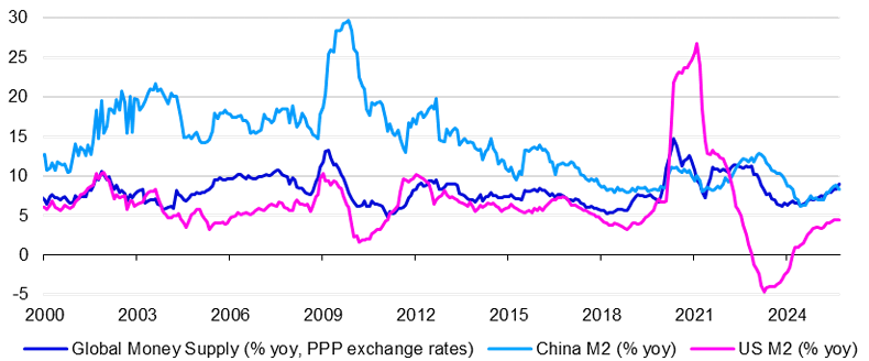 Poznámka: na základě měsíčních dat od ledna 2020 do září 2025. „Globální peněžní zásoba“ vychází z