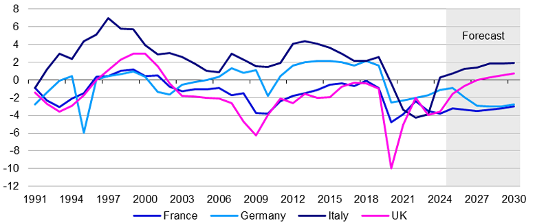 Abychom zdůraznili smíšenou povahu fiskálního výhledu v roce 2026, obrázek 4 popisuje prognózu MMF ohledně cyklicky očištěných primárních rozpočtových sald. Zatímco Německo by mělo poskytnout fiskální podporu své ekonomice (prostřednictvím vyšších deficitů), Itálie a Spojené království by měly učinit opak a konsolidovat své veřejné finance. Německo má v zásadě mnohem nižší dluhové zatížení než Itálie a Spojené království (a Francie) a nyní je v mnohem lepší pozici, aby podpořilo svou ekonomiku prostřednictvím výdajů na armádu a infrastrukturu. Očekává se, že tato výhoda bude pokračovat i v roce 2027, po kterém se předpokládá stabilizace deficitů Německa, zatímco Francie, Itálie a Spojené království by měly dále zpřísňovat svou fiskální politiku.“