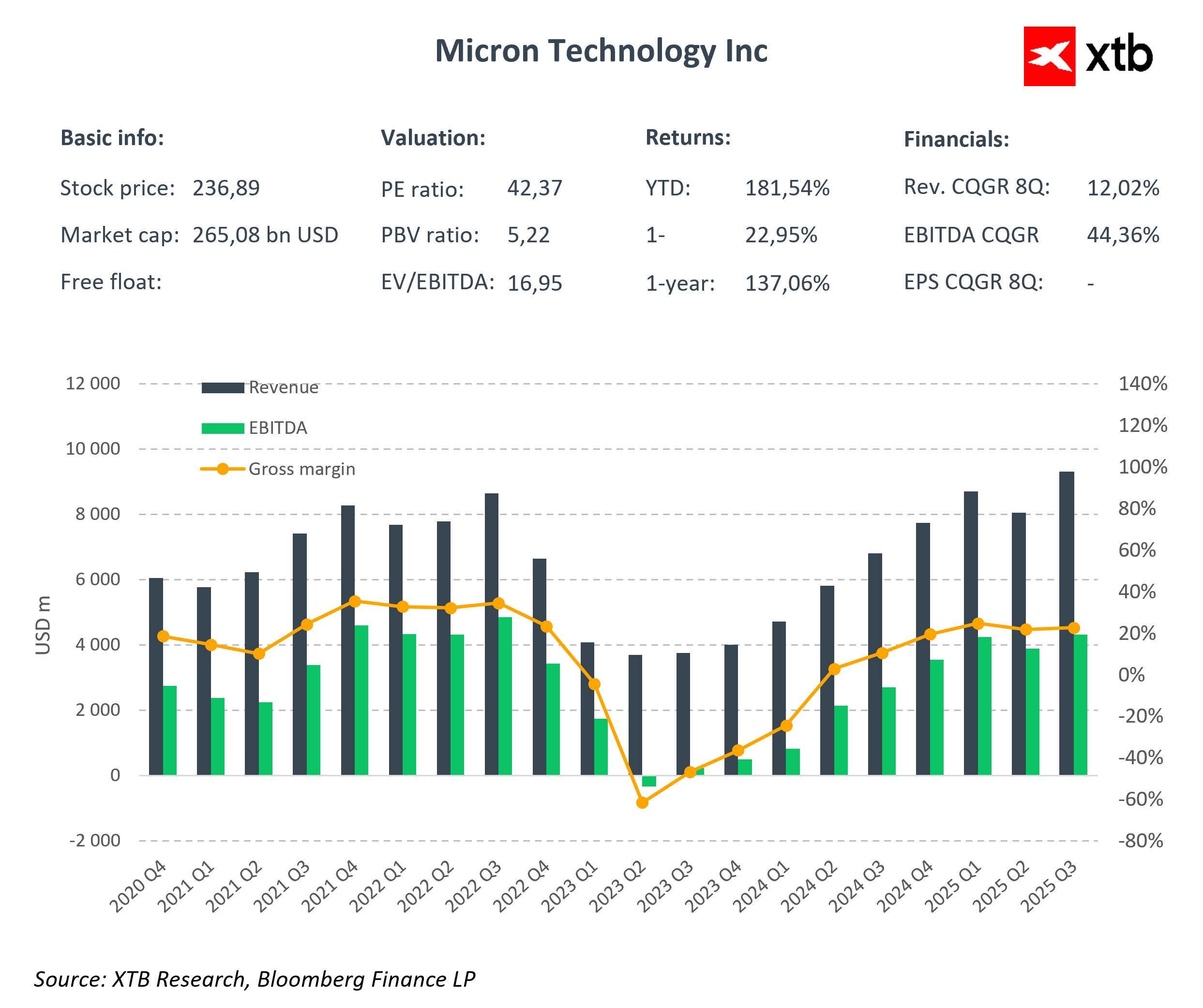 Společnost Micron Technology Inc. (MU.US), přední americký výrobce paměťových čipů zaznamenala růst o 15 % - nejvíce za téměř 13 let - poté, co vydala lepší výhled tržeb a zisku. Ty pohání rostoucí poptávka po hardwaru pro umělou inteligenci (AI). Očekávané tržby za první čtvrtletí fiskálního roku činí přibližně 8,7 miliardy dolarů, což překonává odhady analytiků, kteří počítali s 8,32 miliardy dolarů. Micron také předpokládá zisk 1,74 dolaru na akcii, což převyšuje projekce 1,52 dolaru. -