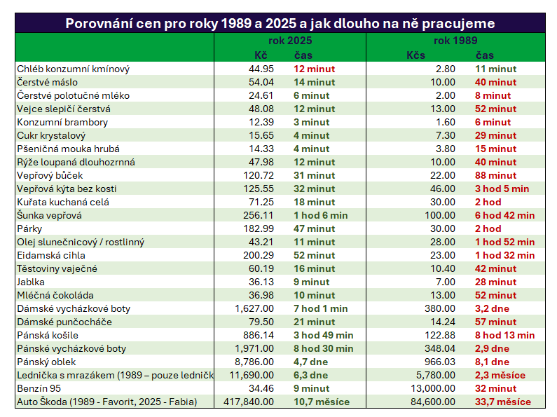 Potvrzují to výpočty socialistických a současných cen v porovnání s průměrnou mzdou v roce 1989 a dnes. Z nich vyplývá, že z běžných potravin vyděláváme déle pouze na chléb – v průměru navíc o pouhou 1 minutu, při průměrné čisté mzdě 38 815 Kč (zdroj: ČSÚ, 2. čtvrtletí 2025). V roce 1989 to bylo pouze 11 minut při čisté mzdě 2500 Kč (zdroj: ČSÚ). Jen o něco levnější je si vydělat na litr čerstvého polotučného mléka – dnes to trvá 6 minut, před revolucí 8 minut.