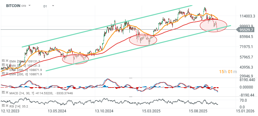 Bitcoin zůstává ve svém dlouhodobém vzestupném kanálu, ale absence krátkodobých fundamentálních katalyzátorů – zejména pozitivních toků ETF – vedla k zřetelnému oslabení tržního sentimentu. Cena se obchoduje přibližně 15 % pod 200denním EMA a nachází se v dolní části kanálu. Průlom pod hranici 90 000 USD by mohl signalizovat trvalejší obrat trendu.