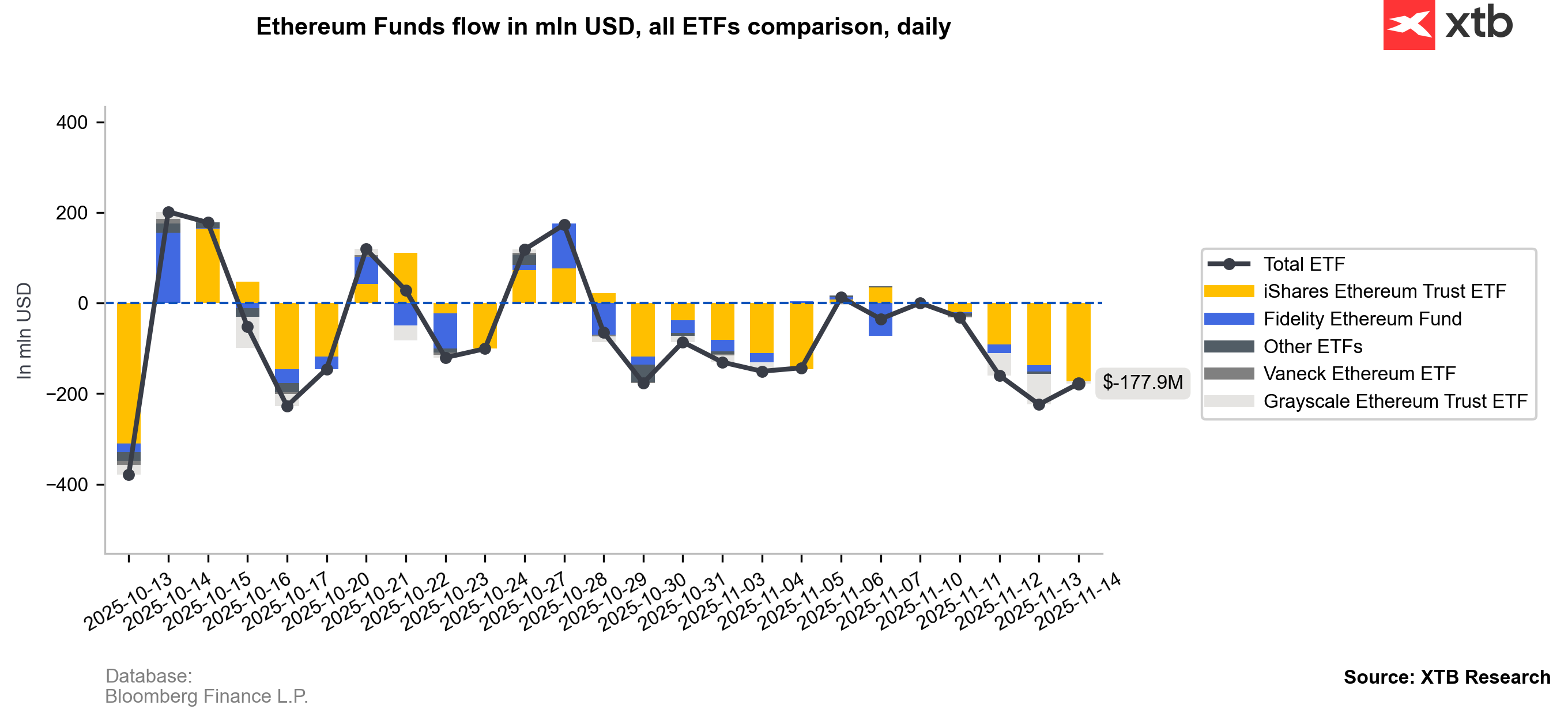 Kryptoměny zahájily pondělní seanci poklesem a během noci bitcoin krátce klesl na 92 500 USD, čímž smazal své dosavadní zisky; ethereum kleslo zpět pod 3 000 USD. Výprodej se částečně obrátil, když se zlepšila nálada na americkém trhu s futures a asijská seance nepřinesla další silný výprodej. Podle CoinGlass zaznamenal kryptotrh za posledních 24 hodin další vlnu likvidací v celkové výši více než 620 milionů dolarů, z čehož téměř 70 % pocházelo z dlouhých pozic v BTC a ETH. Tlak pochází převážně z rostoucích čistých odtoků amerických spotových ETF a takzvaného čtyřletého cyklu, což může naznačovat, že úroveň 126 000 dolarů byla vrcholem bitcoinu během tohoto býčího trhu. Ve čtvrtek 13. 11. 2025 zaznamenaly americké ETF odlivy v celkové výši téměř 870 milionů dolarů, což je druhá nejvyšší úroveň v historii.