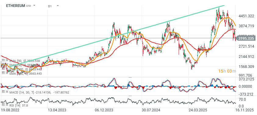 Ethereum kleslo téměř o 40 % ze svých historických maxim, přičemž vzdálenost od 200denního EMA je podobná jako u bitcoinu – kolem 15 %. Klíčová úroveň, kterou je třeba znovu získat, je nyní zhruba 3 600 USD; pokles pod 3 000 USD by mohl vyvolat kaskádový výprodej směrem k zóně 2 700 USD, kde došlo k předchozím cenovým reakcím.