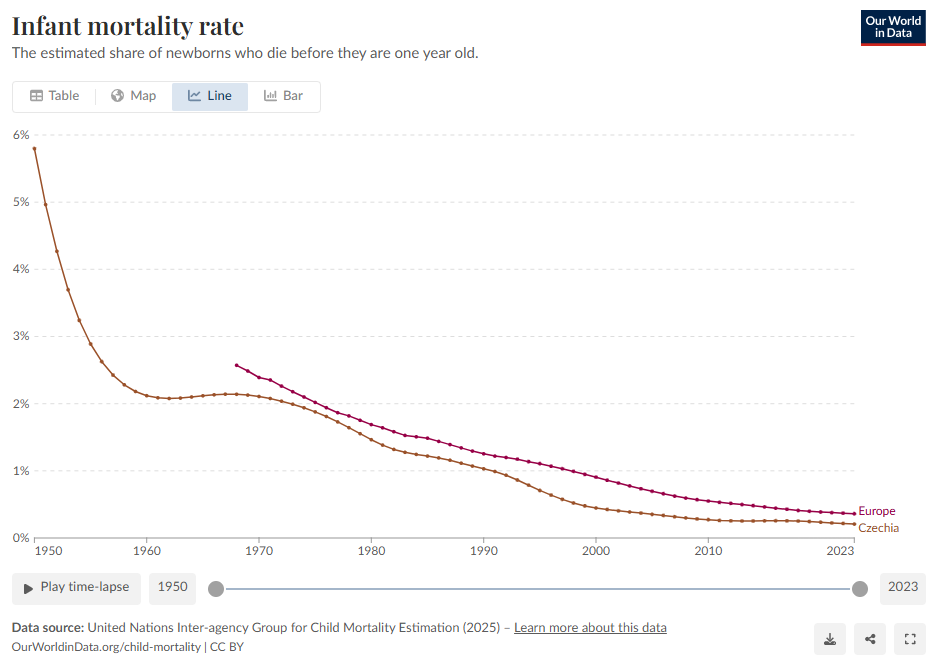 A to přesto, že za socialismu se podařilo v tehdejším Československu zásadně redukovat kojeneckou úmrtnost. Podíl zemřelých dětí do jednoho roku věku se mezi lety 1950 až 1970 snížil z necelých šesti na zhruba dvě procenta, tedy na celoevropsky podprůměrnou úroveň (viz graf níže). Na celoevropsky podprůměrné úrovni zůstává ukazatel setrvale dodnes, kdy v ČR činí zhruba 0,2 procenta.