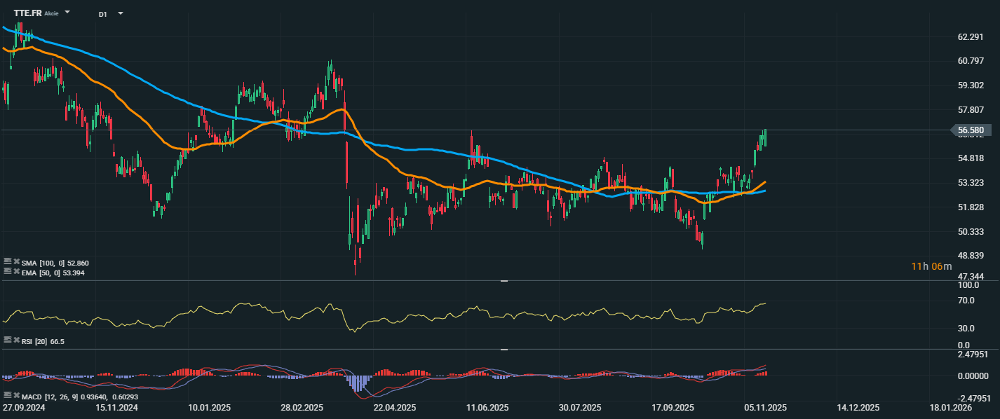 Akcie společnosti TotalEnergies zaznamenaly výrazný růstový obrat, když během posledních týdnů prudce posílily a aktuálně se obchodují na úrovni 56,58 EUR. Tento růst znamená průraz nad obě klíčové technické úrovně – EMA 50 (53,39 EUR) i SMA 100 (52,86 EUR), což je jasný signál změny trendu směrem k růstu. RSI se nachází na hodnotě 66,5, což potvrzuje silné nákupní momentum, přičemž akcie se blíží do pásma překoupenosti. MACD rovněž generuje býčí signál, jelikož se hlavní linie nachází nad signální, a histogram posiluje, což podporuje pokračování růstového trendu.