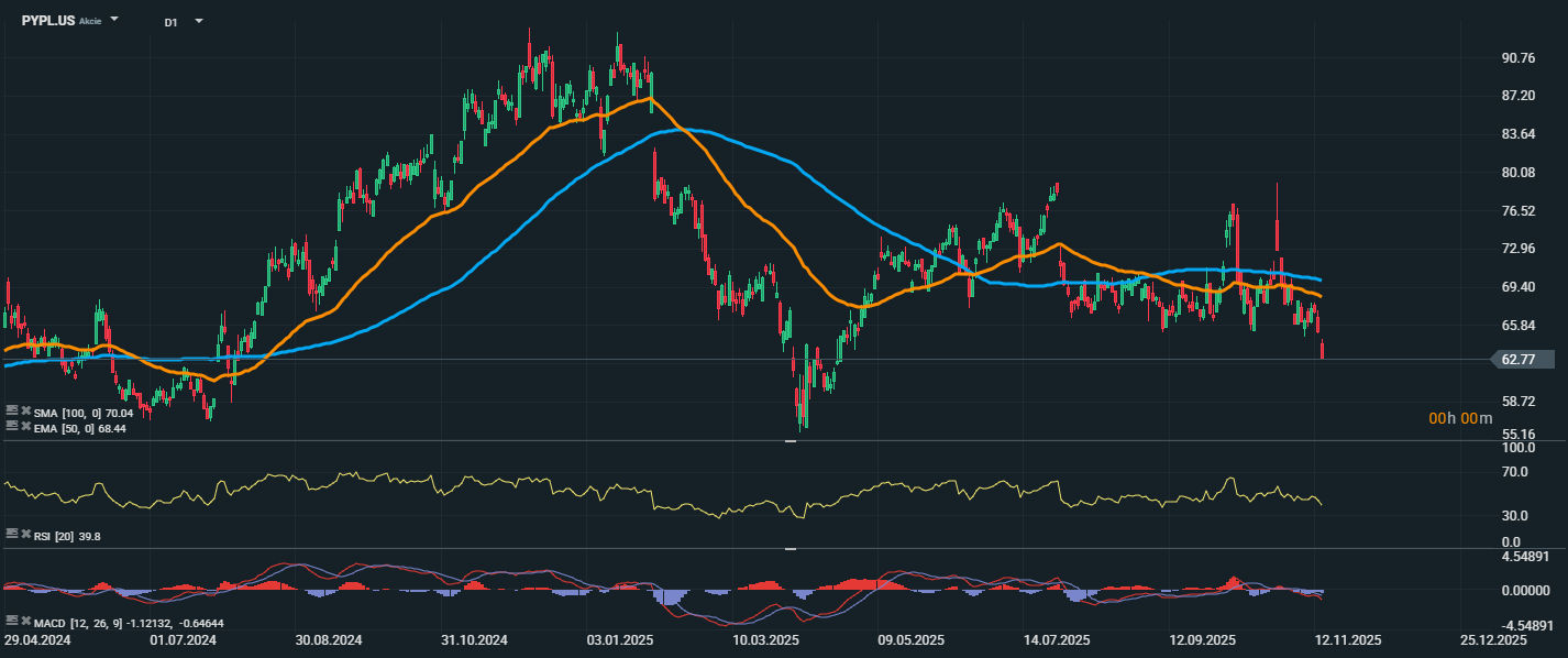 Akcie PayPalu oslabují a aktuálně se obchodují na úrovni 62,77 USD, což znamená průraz pod důležitou podporu z boční konsolidace posledních měsíců. Cena se nyní nachází hluboko pod klouzavými průměry – EMA 50 (68,44 USD) a SMA 100 (70,04 USD), což potvrzuje jasný medvědí trend. RSI (39,8) signalizuje slábnoucí momentum a blížící se přeprodanost, ale bez známky obratu.