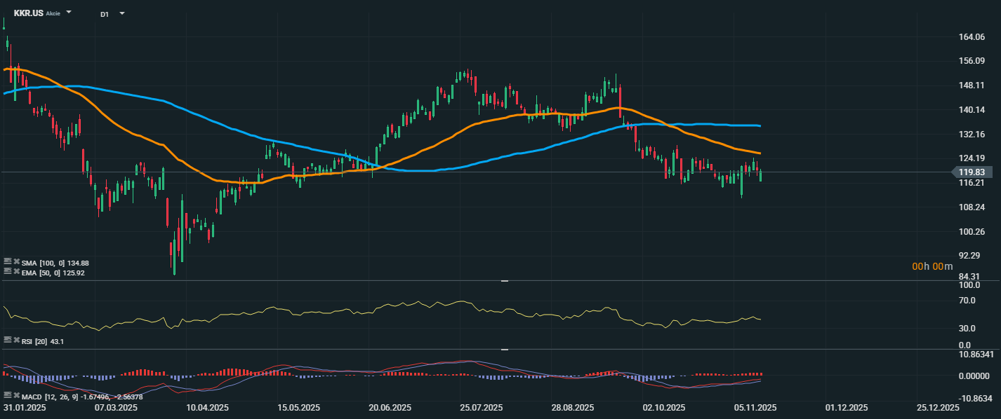 Akcie investiční společnosti KKR se aktuálně obchodují na 119,83 USD a od začátku listopadu vykazují stabilizační tendenci po předchozím poklesu. I zde se ale cena drží pod EMA 50 (125,92 USD) i SMA 100 (134,88 USD), takže zůstává v medvědím nastavení. RSI (43,1) zůstává pod neutrální hodnotou, ale nepropadá se – svědčí o určité stabilizaci. Krátkodobě je trh v konsolidaci mezi 116–125 USD, průraz nad EMA 50 by byl první pozitivní signál.