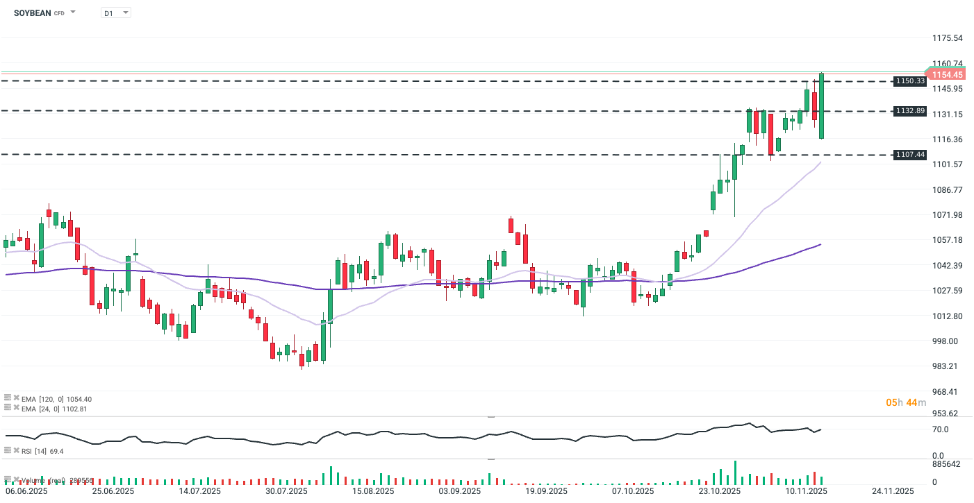 Kontrakt SOYBEAN se prudce odrazil od ranního výprodeje, čímž cena vystoupala na 15měsíční maximum. RSI aktuálně vstupuje do překoupené oblasti, přičemž změny v nabídce a poptávce pravděpodobně udrží zvýšenou valuaci. Zdroj: xStation5
