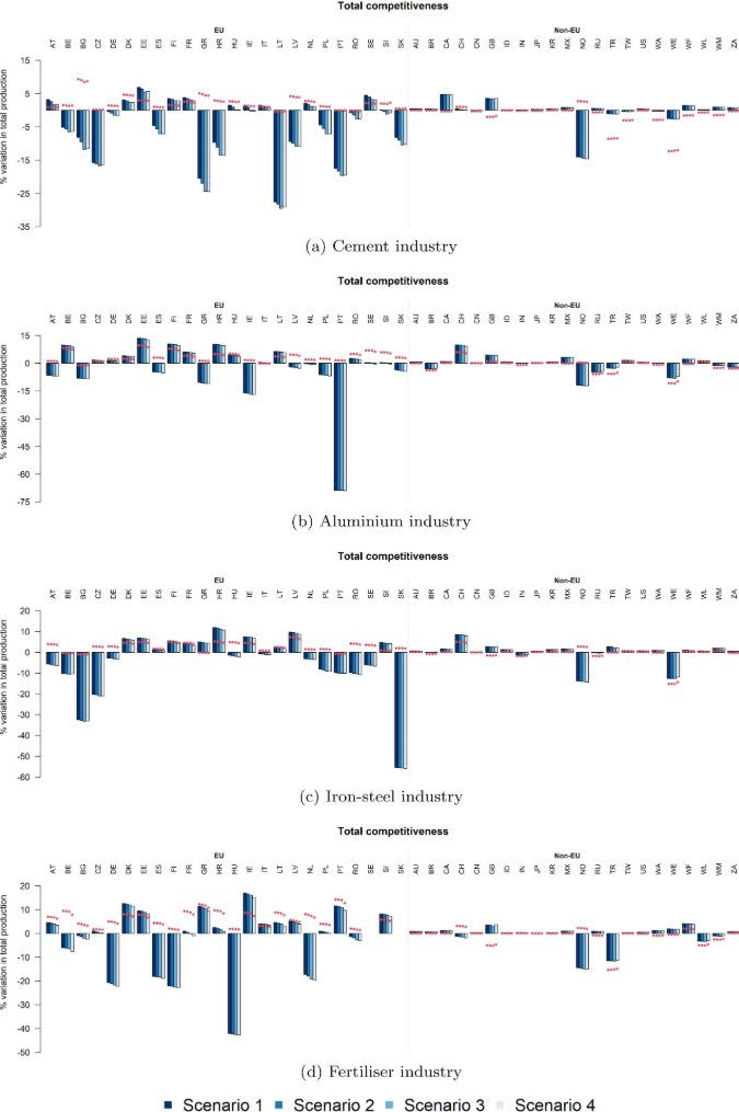 Dopad na jednotlivá nejvíce zatížená odvětví zachycují grafy níže, které pocházejí ze zmíněného odborného článku v žurnálu Energy Economics, jenž vyšel letos v únoru. Grafy zachycují také to, že dopad na některé země EU bude mnohem tíživější než na země mimo EU (které jsou v pravé části daných grafů).