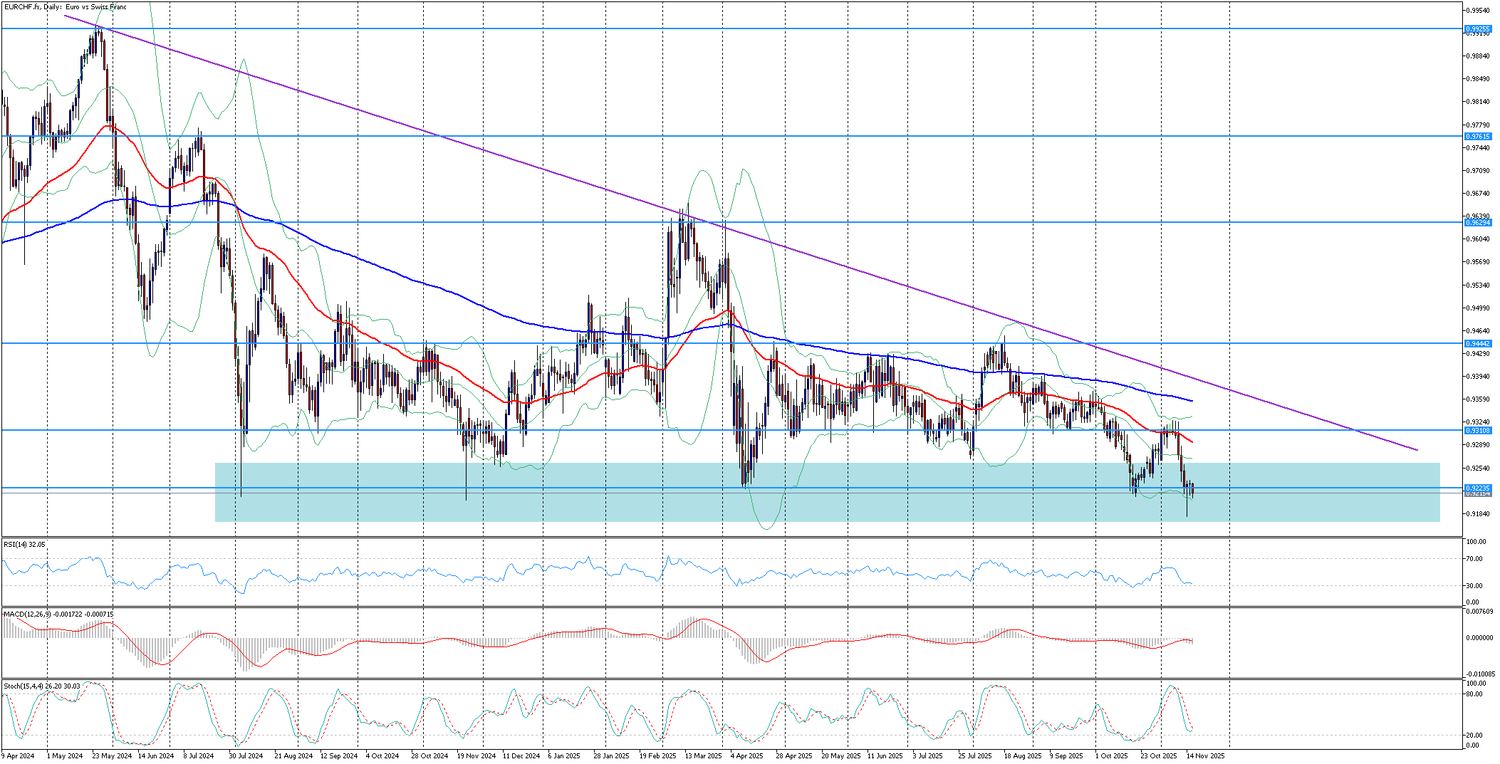 EUR/CHF se minulý týden propadl na nové víceleté minimum 0,9178, což je nejnižší hodnota od roku 2015. Švýcarský frank posílil poté, co obchodní dohoda mezi USA a Švýcarskem zvýšila zájem investorů o bezpečná aktiva. Dalším faktorem je i skutečnost, že se stále neobjevují žádné konkrétní náznaky, že by Švýcarská národní banka (SNB) zvažovala návrat sazeb zpět do záporného teritoria. Cena krátce klesla pod dlouhodobě sledovanou hranici 0,9200, která od srpna 2024 spolehlivě zastavovala prodejce. Býkům se však podařilo rychle získat kontrolu a vrátit trh zpět nad tuto úroveň, což naznačuje, že dlouhodobá podpora zatím zůstává funkční. Pátek navíc přinesl výraznou býčí reakci – svíčka s dlouhým spodním stínem ukazuje na obnovený zájem kupců. K potvrzení stabilizace ale bude nutná další silná seance, protože RSI i stochastický oscilátor stále ukazují na přeprodané podmínky. Pokud se ceně podaří udržet nad 0,9200 a prorazit nad oblast 50denních SMA kolem 0,9300, mohl by trh zamířit k významné rezistenční linii z maxima roku 2021, která se aktuálně sbíhá s 200denním SMA v zóně 0,9360. Její překonání by otevřelo prostor pro růst směrem k úrovni 0,9440. Naopak návrat pod 0,9200 by znovu vystavil trh tlaku medvědů a další opora by se formovala až kolem 0,9135. Celkově se EUR/CHF i přes prudký pokles stále pohybuje v široké dlouhodobé neutrální zóně mezi podporou 0,9200 a silnou rezistencí 0,9365, přičemž trh nyní sleduje, zda dokáže na současném odrazu dále stavět.