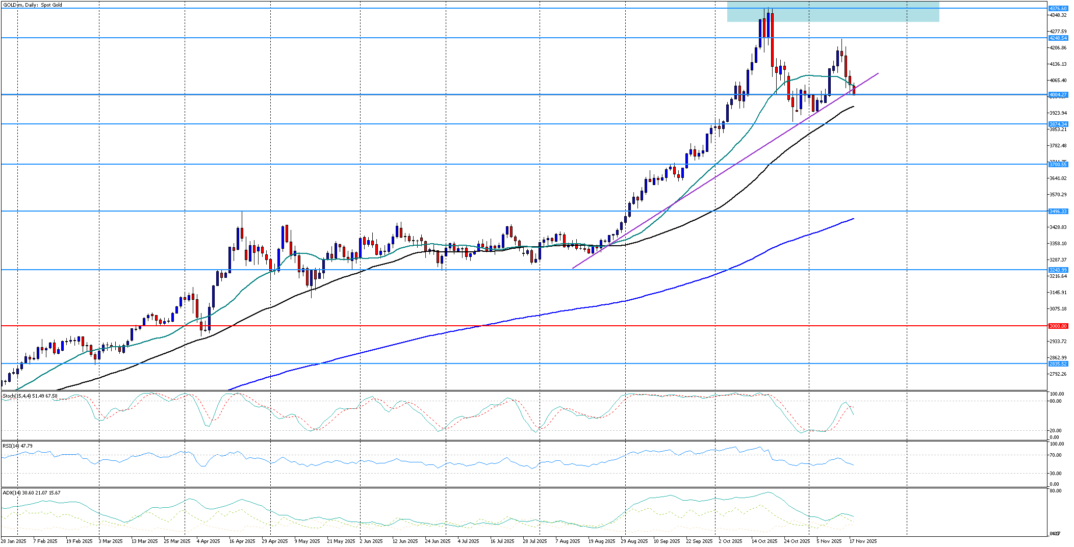 Zlato zakončilo páteční seanci silným výprodejem, když se drahé kovy dostaly do stejného směru jako akcie i kryptoměny. Impulsem byl komentář prezidenta kansaského Fedu Jeffa Schmida, který uvedl, že zpomalení amerického trhu práce je částečně způsobeno dlouhodobými strukturálními faktory – zejména změnami v imigraci a technologickém pokroku. Schmid zároveň upozornil, že další snížení sazeb by mělo jen omezený účinek na napjatost trhu práce a zároveň by mohlo znovu oživit inflační tlaky. Trh okamžitě přecenil sázky na prosincové snížení sazeb, jehož pravděpodobnost klesla k úrovni okolo 56 %. Zlato v reakci oslabilo přibližně o 2 %, ale i po prudkém výprodeji se drží v blízkosti 20denního jednoduchého klouzavého průměru (SMA) u úrovně 4 000. Tato hladina má zvýšený význam, protože odpovídá krční linii formace dvojitého dna vytvořené v minulém týdnu. Uzavření pod tímto pásmem by mohlo otevřít prostor pro hlubší korekci směrem k 50dennímu SMA a podpoře v oblasti kolem 3 930. Ještě výraznější pokles by mohl stlačit cenu až k úrovni 3 845, což by představovalo čerstvé nižší minimum a potenciální potvrzení krátkodobého medvědího obratu. Indikátory momenta však ukazují smíšený obraz. RSI se stále drží nad hranicí 50 a MACD přetrvává nad signální linií, i když jeho poslední obrat směřuje dolů. Tyto signály naznačují, že býci sice utrpěli zásah, ale zatím zcela neopustili trh. Udrží-li se cena nad hranicí 4 000, mohou kupci znovu vyvíjet tlak na odpor 4 130 a následně i na širší bariéru 4 250. Její proražení by z technického hlediska znovu otevřelo cestu k psychologickým úrovním 4 400 a 4 500. Výprodej zlata snížil sílu býčí tendence, ale trh zůstává v klíčové rozhodovací zóně. Udržení nad 4 000 je pro kupce zásadní, stejně jako průlom nad 4 250. Naopak pád pod 3 930 by pravděpodobně znamenal přechod do další fáze medvědího trendu.