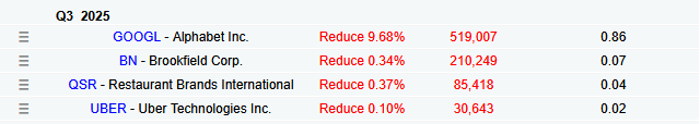 Pershing Square Capital, který vede Bill Ackman, ve třetím kvartále pouze redukoval své pozice. Hedge fond prodal 519 tis. akcií třídy A technologického konglomerátu Alphabet, který při započítání akcií třídy C byl na konci kvartálu třetí největší pozicí. Hedge fond také kosmeticky redukoval své dvě největší pozice. Přesněji v přepravní společnosti Uber a investiční společnosti Brookfield Corp. Poslední pozici, kterou fond lehce ponížil, byla v provozovateli mezinárodních řetězců s rychlým občerstvením Restaurant Brands International