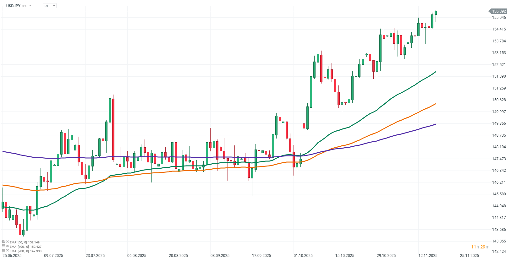 USD/JPY se aktuálně obchoduje kolem úrovně 155,40. Dnešní pohyby jsou zřetelně ovlivněny fundamentálními faktory, přičemž rovnováha sil mezi Japonskem a Spojenými státy stále hraje ve prospěch dolaru. Navzdory zhoršení globální nálady se trhy neobracejí k jenu, což poukazuje na jeho strukturální slabost způsobenou politikou Bank of Japan a výrazným úrokovým rozdílem. Pozornost se zároveň soustředí na vnitropolitické napětí v Japonsku, očekávání ohledně Fedu a soubor nadcházejících amerických makrodat, která mohou určit další vývoj měnového páru.