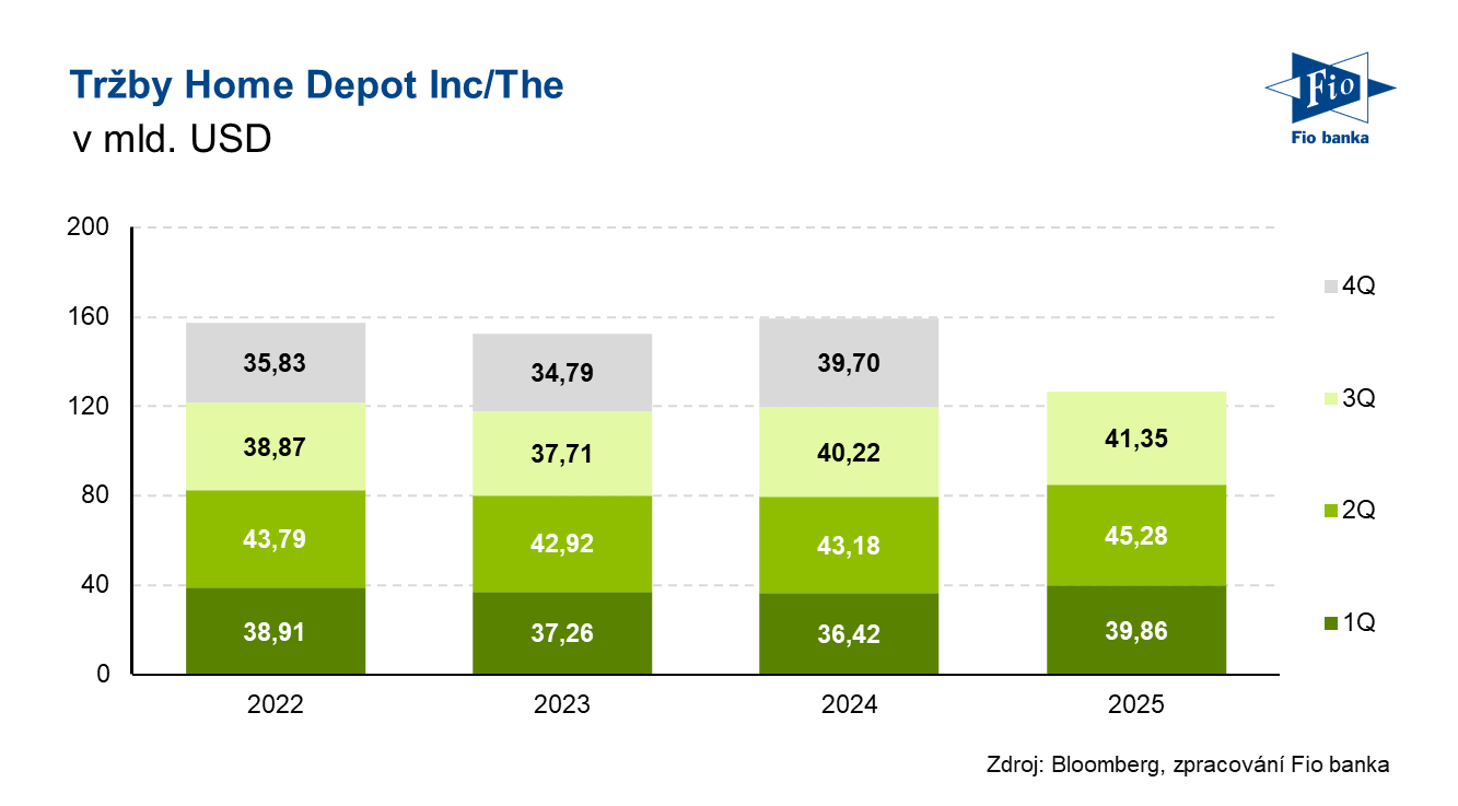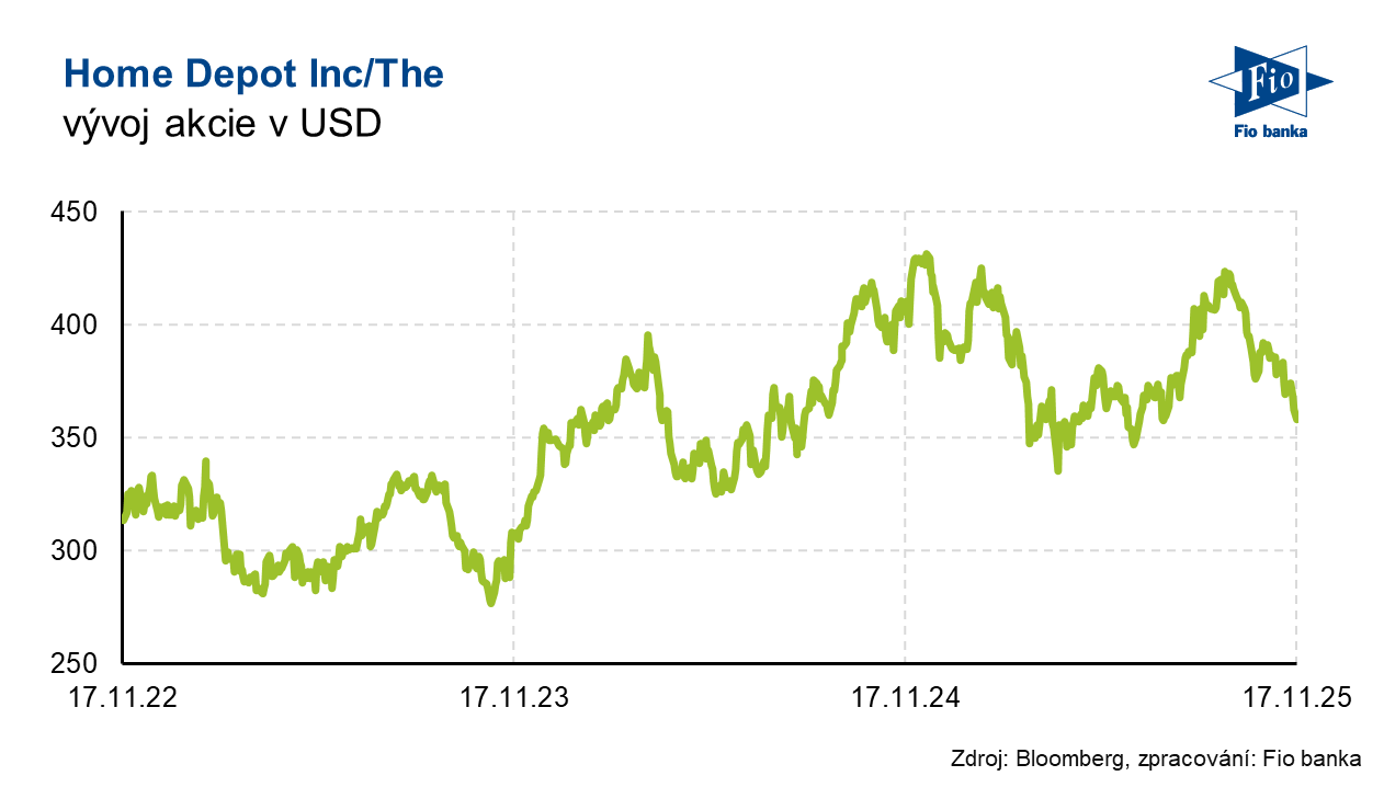 Americký obchodník s domácím vybavením Home Depot reportoval výsledky hospodaření za třetí kvartál 2025, který skončil 2. listopadu. Společnost reportovala v uplynulém kvartálu nižší než očekávané porovnatelné tržby a zisk. Společnost tyto slabší čísla odůvodnila oslabením trhu s bydlením a útlumu poptávky po střešní krytině, generátorech z důvodu nedostatku bouří. Společnost také snížila roční výhled, dle Home Depot část zákazníků odkládá velké nákupy z důvodu nejistoty.