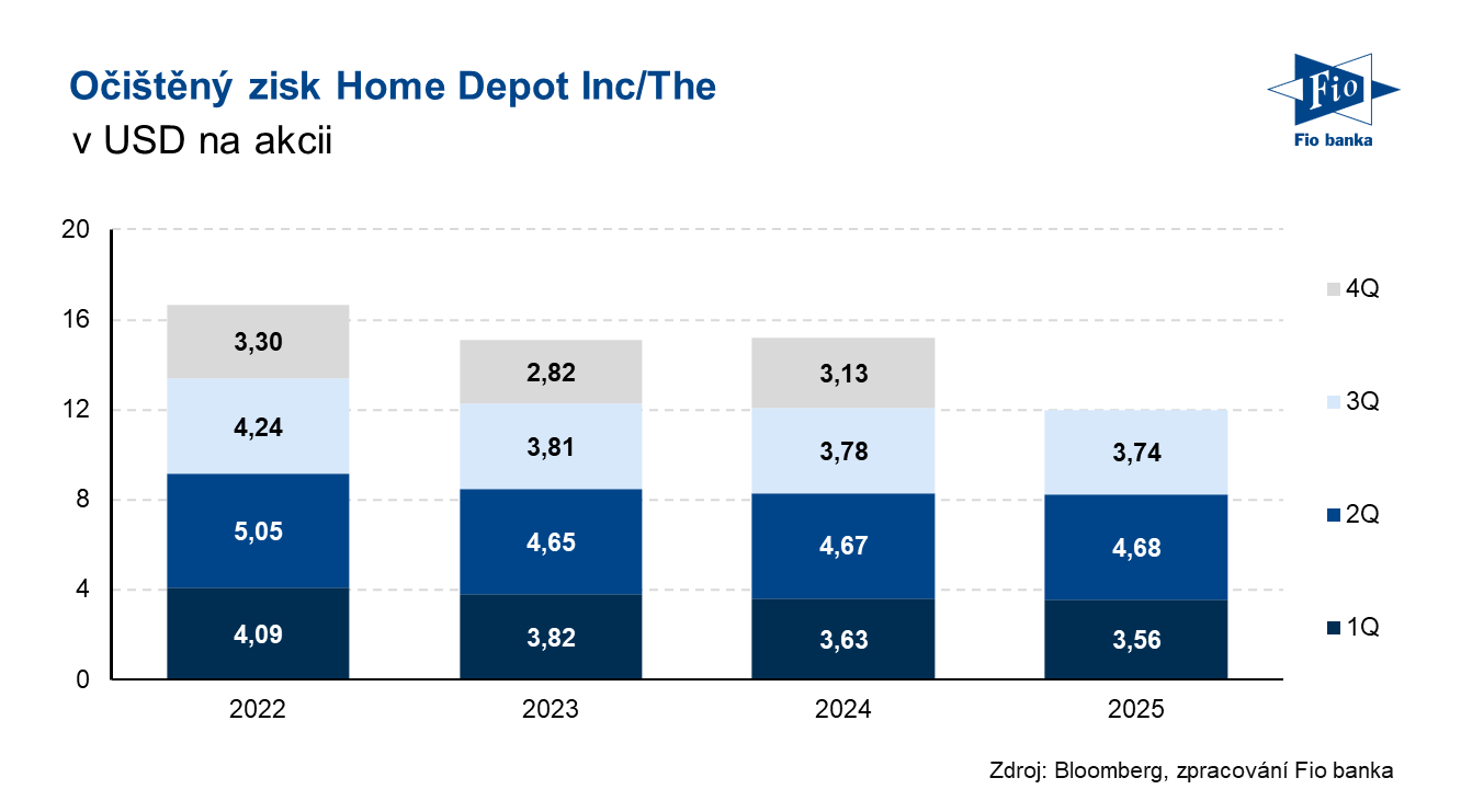 Klíčová slova: Akcie | Transakce | Bloomberg | Dividendový výnos | Obchodník | P/E | Ukazatel | Výnos | Zisk na akcii | USD | Obchodování | Zisk | Výsledky | EPS | Banka | Fio banka | Cena | Fio | Fiskální rok | Trh | Cílová cena | Tržby | Kapitalizace | Výhled | Konsensus | Očekávání | Akcie společnosti | Čistý zisk | Nejistoty | Hospodaření | Výsledky hospodaření | Pokles | Provozní zisk | Meziroční růst | Vývoj | Spotřebitelé | Růst | Růst tržeb | Výhled na rok | Vývoj akcie | Akcie Home Depot | Home Depot | Home Depot (HD) | Společnosti | Společnost | Výsledky společnosti | 3М | Jakub Němec | Pokles zisku | Očištěný zisk na akcii | Nákupy | Fio banka, a.s. | Tržby a zisk | Rok 2025 | Výhled na rok 2025 |