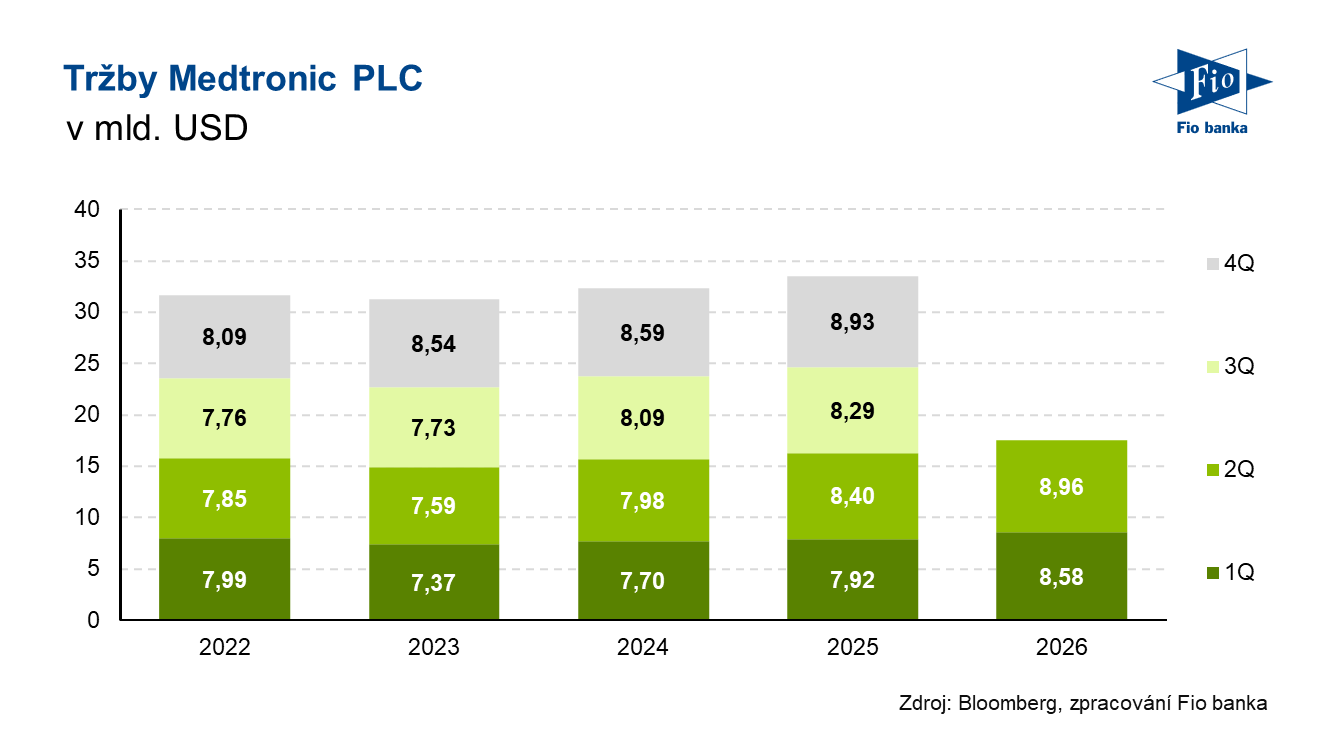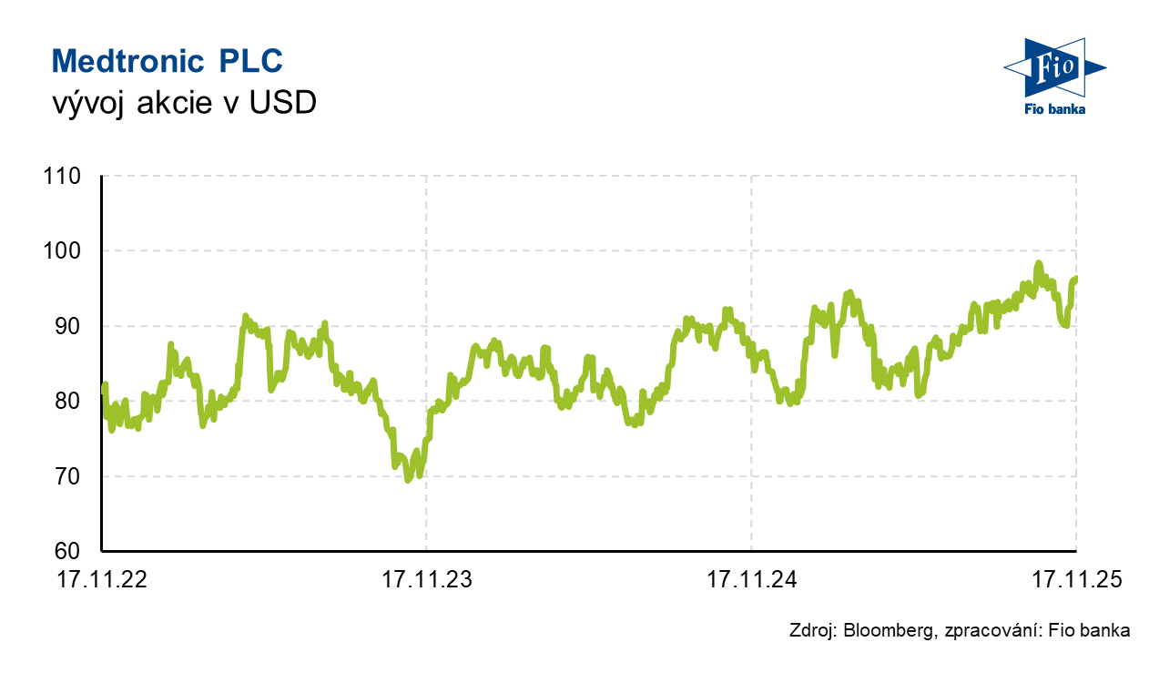 Společnost Medtronic, výrobce zdravotnických zařízení, zveřejnila výsledky za 2. čtvrtletí fiskálního roku 2026, které skončilo 24. října. Tržby i očištěný zisk na akcii mírně překonaly průměrné odhady analytiků. Firma zároveň zpřesnila výhled na celý fiskální rok 2026, když zvýšila spodní hranici očekávaného očištěného zisku na akcii a navýšila také výhled organického růstu tržeb.