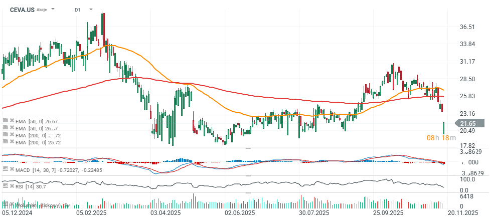 Akcie Ceva (CEVA.US) klesají o více než 10 %, ale část ztrát již umazaly po oznámení veřejné nabídky 3 milionů akcií. Upisovatelé zároveň získali 30denní opci na nákup dalších 450 000 akcií. Všechny akcie prodává sama společnost, která plánuje výnosy využít na potenciální akvizice, technologické investice nebo další firemní účely jako provozní kapitál, investice nebo zpětné odkupy.