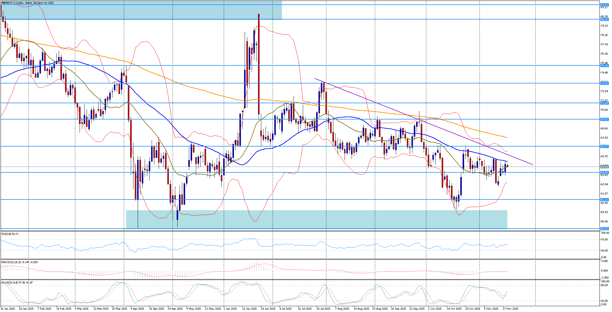 Futures na ropu BRENT se nadále obchodují pod mírným tlakem, protože cena zůstává pod krátkodobou klesající trendovou linií a pohybuje se v těsné blízkosti 20denního klouzavého průměru (SMA) kolem 64,70. Tato kombinace technických bariér brzdí pokusy o růst a udržuje trh v defenzivním nastavení. Medvědí sentiment byl navíc podpořen nedávným nárůstem zásob, který převážil nad obavami týkajícími se potenciálních výpadků způsobených sankcemi vůči Rusku. Pokud cena z aktuálních úrovní opět oslabí, nejbližší strukturální oporu představuje úroveň 62,70. Její prolomení by pravděpodobně otevřelo cestu k testu téměř šestiměsíčního minima na 59,90. V případě, že by trh pokračoval v medvědím tempu, další pozornost by se soustředila na oblast kolem 55,60, která funguje jako významná střednědobá podpora. Naopak růstový scénář by vyžadoval průraz nad krátkodobou klesající trendovou linii. Úspěšné překonání této bariéry by mohlo nastartovat býčí aktivitu směrem k rezistenci na 66,77, následované 200denním SMA poblíž 67,75. Posun nad tuto zónu by signalizoval stabilizaci trhu a potenciální posun směrem k neutrálnímu výhledu. Indikátory však zatím ukazují na váhavost. RSI se drží poblíž hodnoty 50 a MACD osciluje okolo nulové linie, což poukazuje na nedostatek jasného směrového momenta. Celkově tak trh zůstává sevřen mezi klíčovými úrovněmi, které nyní rozhodnou o dalším směru trendu.