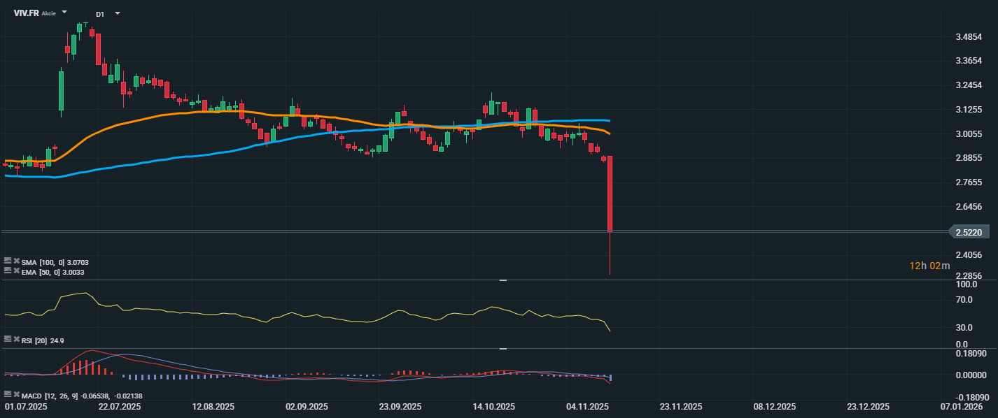 Akcie společnosti Vivendi dnes zaznamenaly prudký výprodej, když během jediného dne propadly hluboko pod hranici 2,40 EUR. Aktuálně se cena akcií pohybuje o něco výše kolem ceny 2,5220 EUR. Z technického pohledu akcie prorazily pod oba klouzavé průměry – EMA 50 (3,0033 EUR) i SMA 100 (3,0703 EUR) – což potvrzuje výrazné narušení předchozí podpory a otevírá prostor pro další oslabení. RSI propadl na 24,9, což indikuje, že akcie jsou v hluboce přeprodané zóně.