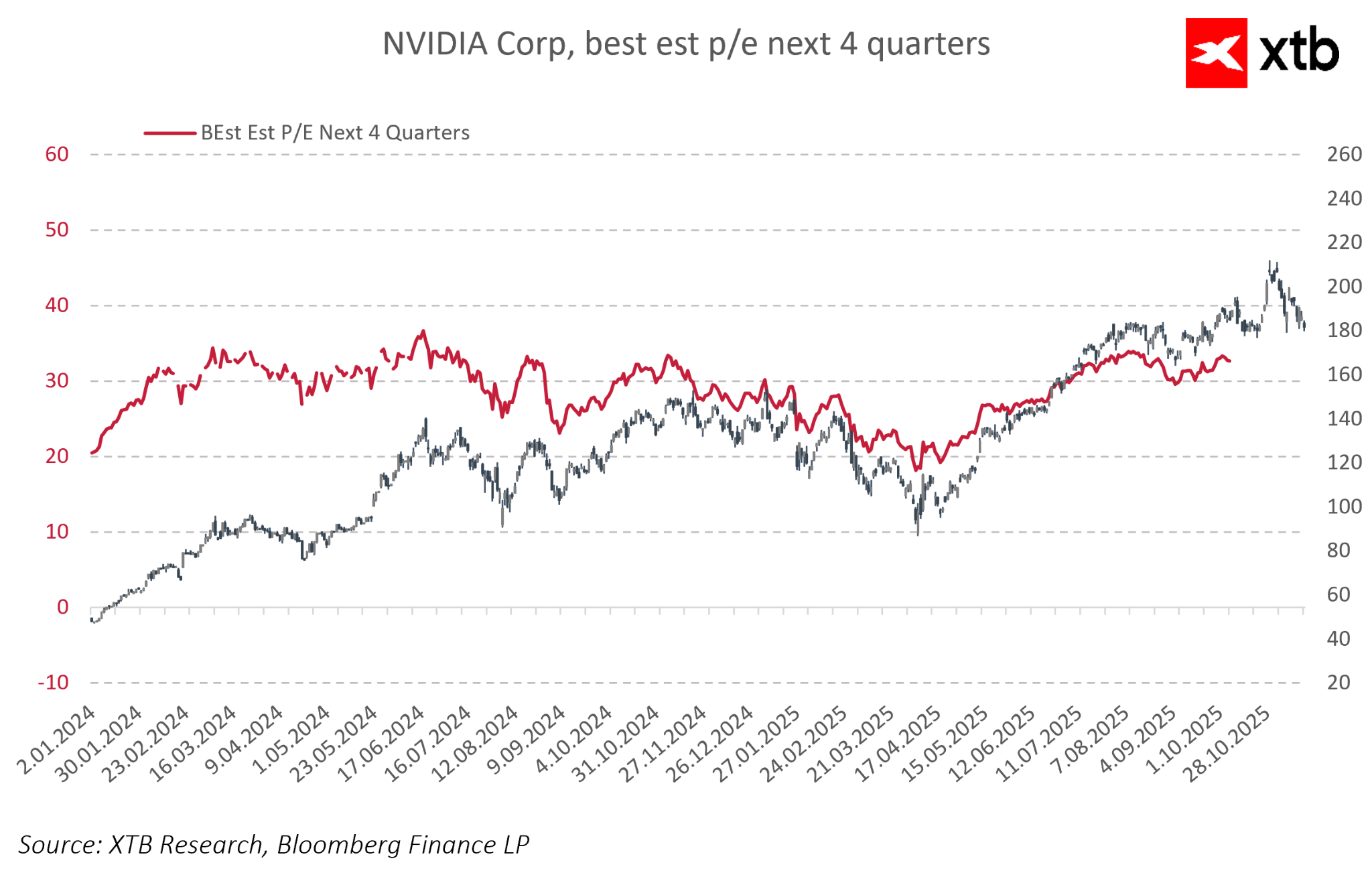 Tento pokles je způsoben dynamickými prognózami zisku na akcii (EPS), přičemž trh neočekává jen udržení růstu, ale další akceleraci zisků z AI a datových center.