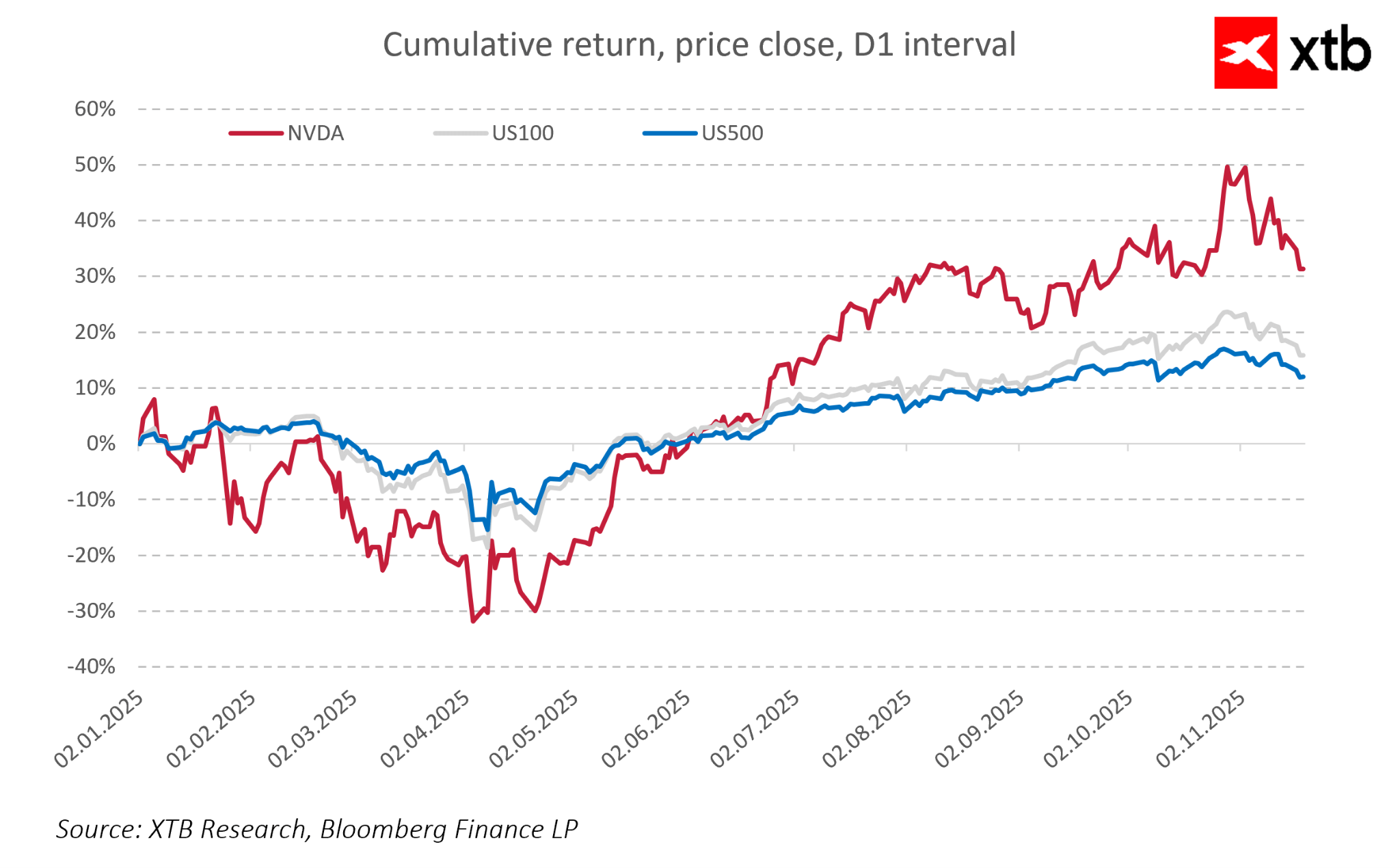 Kumulativní výnosy akcií ve srovnání s hlavními indexy ukazují silný investorský sentiment a výjimečný výkon společnosti Nvidia. Zatímco hlavní indexy letos vzrostly o 10–20 %, akcie Nvidie přinesly výnos přes 30 %, a to i přes nedávné korekce a vysokou volatilitu.