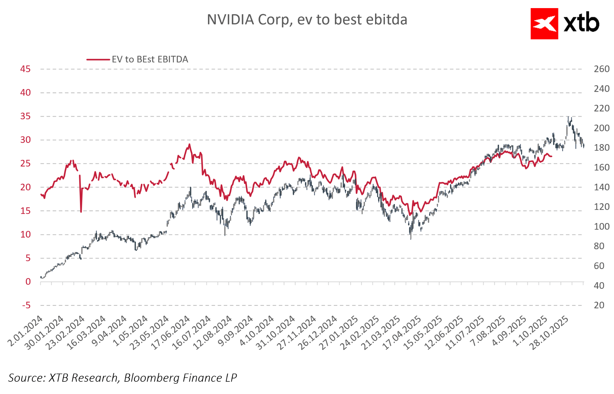 Prémiové ocenění Nvidie vůči ostatním technologickým firmám přetrvává, avšak stále více se opírá o očekávaný růst budoucích provozních zisků. Podobný trend je patrný i u EV/EBITDA ukazatelů, které odrážejí očekávání analytiků ohledně provozní efektivity a marží.