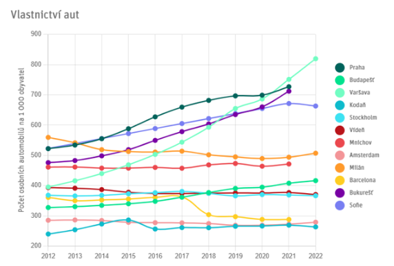 Graf níže z dílny IPR Praha zachycuje trend uplynulých let, kdy v městech zemí střední a východní Evropy – tedy v zemích bývalého východního bloku – přibývá aut v přepočtu na obyvatele tak výrazně, že už zřetelně předčí západní města, která druhdy dominovala.