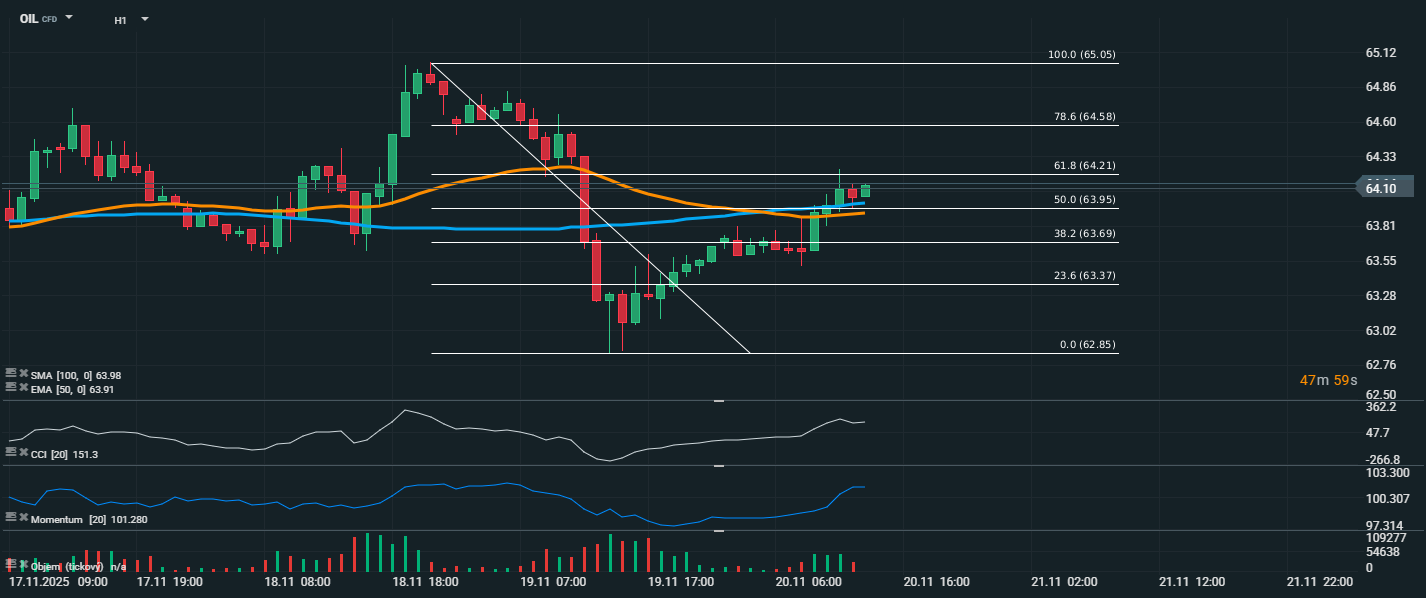 Cena ropy se aktuálně pohybuje kolem 64,10 USD, tedy nad Fibonacciho hladinou 50 % (63,95 USD), která vznikla po předchozím poklesu z 65,05 na 62,85 USD. Proražení této úrovně směrem vzhůru naznačuje potenciální pokračování růstové korekce. Technicky vzato došlo k průrazu krátkodobé klesající trendové linie a následnému růstu nad oba klouzavé průměry – EMA 50 (63,91 USD) i SMA 100 (63,98 USD). Tím se obnovilo krátkodobé býčí nastavení. CCI se nachází na vysoké hodnotě 151,3, což značí překoupenost trhu, ale zároveň potvrzuje sílu nákupního momenta. Stejně tak momentum (101,28) ukazuje na zesilující dynamiku růstu. Objem obchodů v posledních svíčkách rovněž podporuje aktivitu kupců.